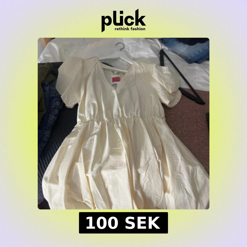 Supersöt ljus kortklänning från H&M med puffiga kortärmar och v-ringad hals. Klänningen har en markerad midja och är gjord i ett lätt, glansigt material som ger en fräsch och somrig vibe. Perfekt för dig som gillar enkel men trendig stil.