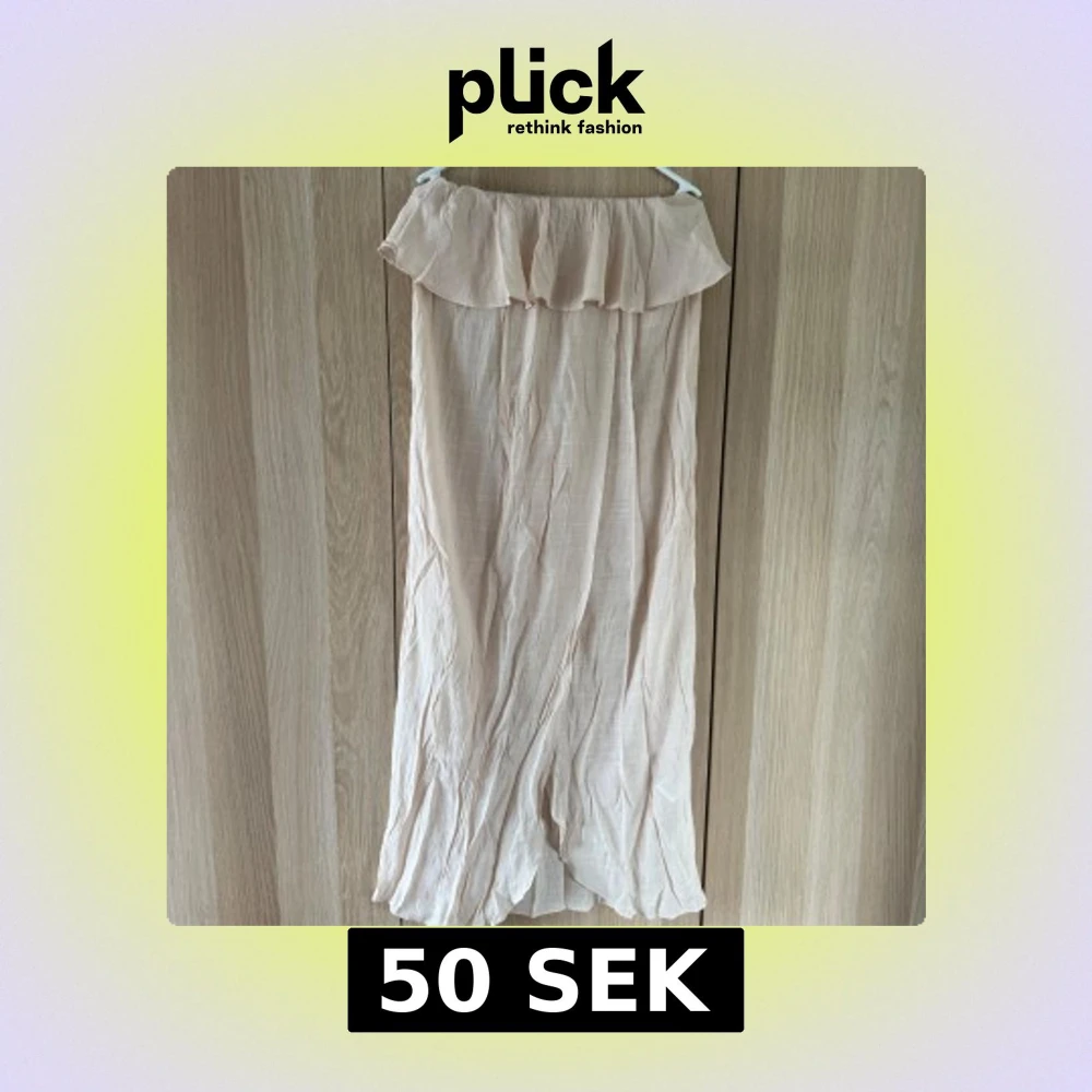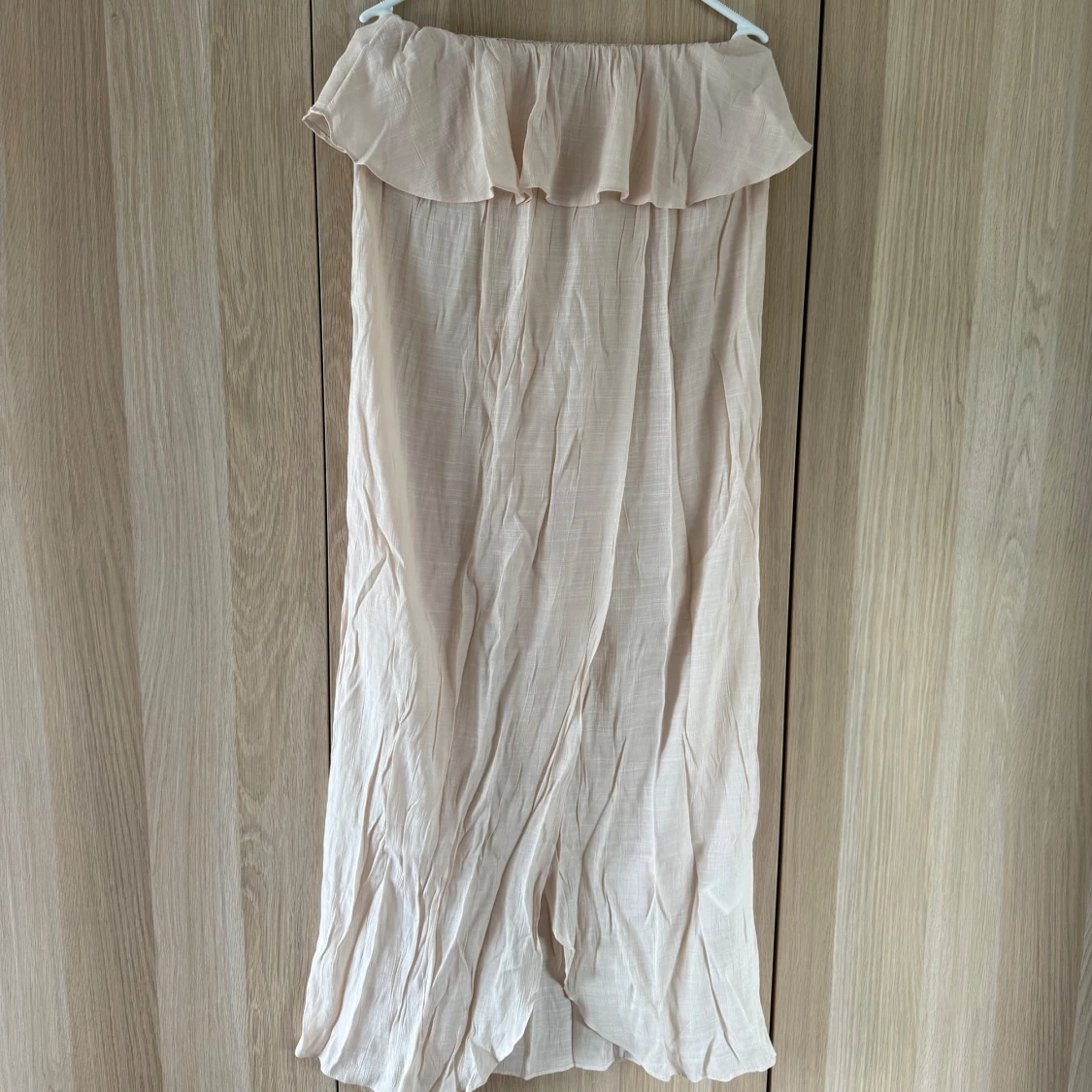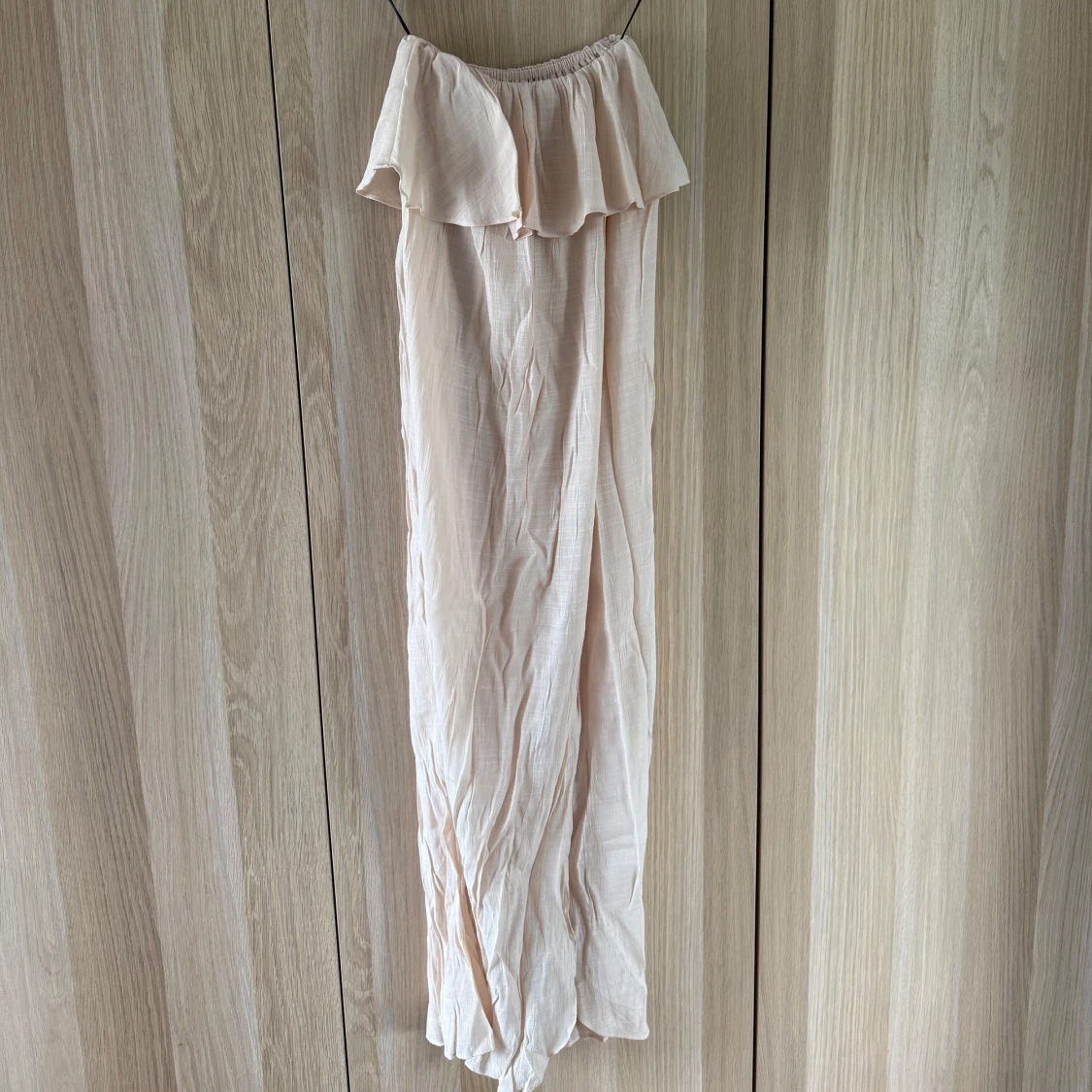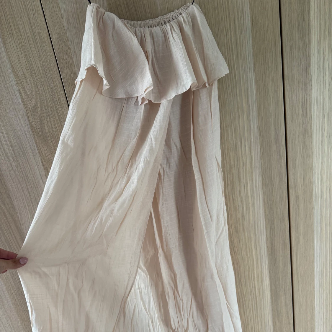 Superfin ljusbeige långklänning med offshoulder och volang upptill. Klänningen är luftig och har en lätt, skir känsla i materialet. Perfekt för varma dagar när du vill känna dig både chill och snygg. Perfekt strandklänning!
