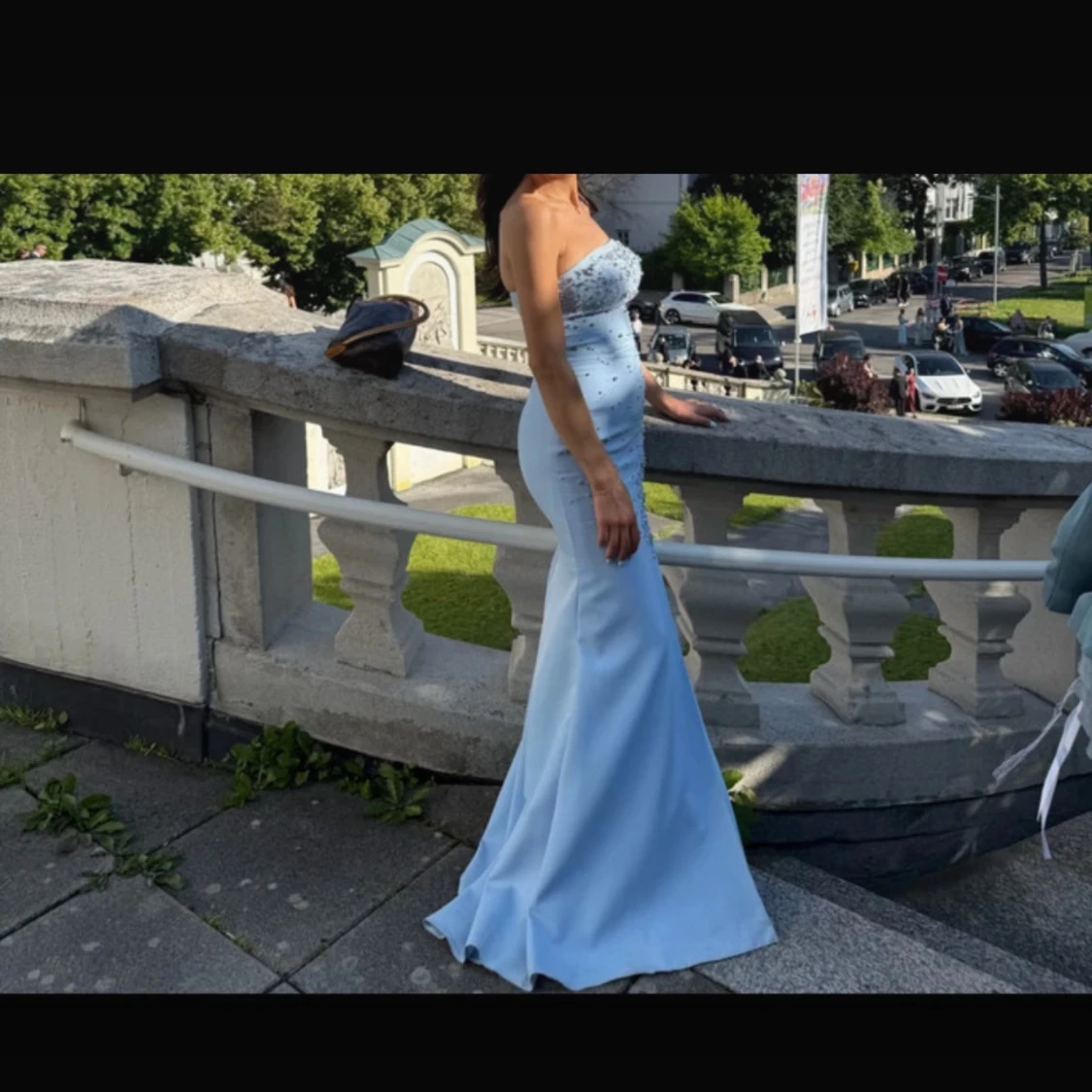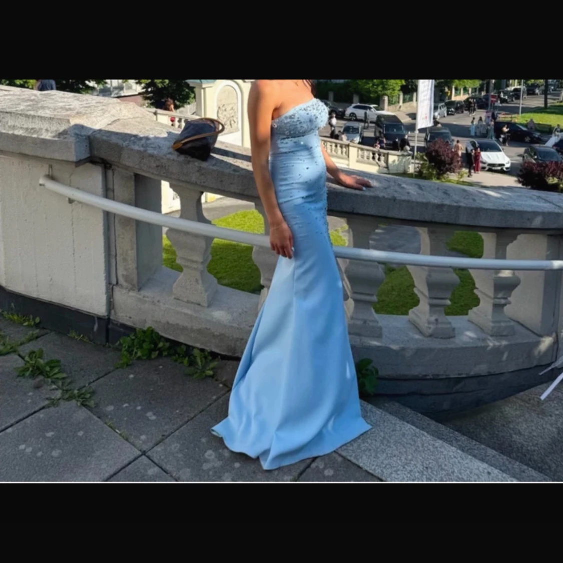Säljer en elegant ljusblå långklänning med axelbandslös design och figurnära passform. Klänningen har glittriga detaljer upptill och en lätt utsvängd nederdel som ger en snygg siluett. Perfekt för bal eller student!