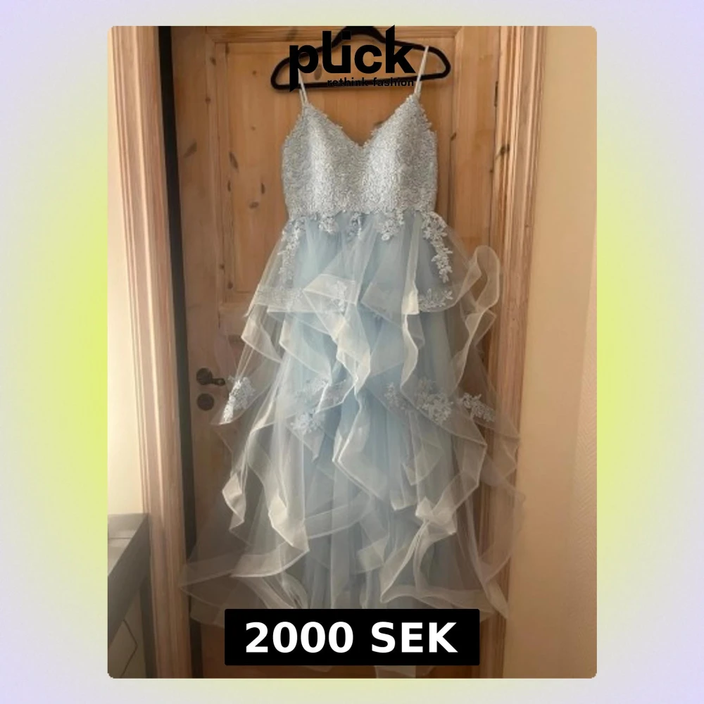 Superfin ljusblå långklänning med tunna axelband, spetsdetaljer upptill och flera lager volangig tyllkjol. Klänningen har v-ringning och blommiga broderier som ger en romantisk känsla. Perfekt för bal eller student! Materialet är mestadels tyll och spets.