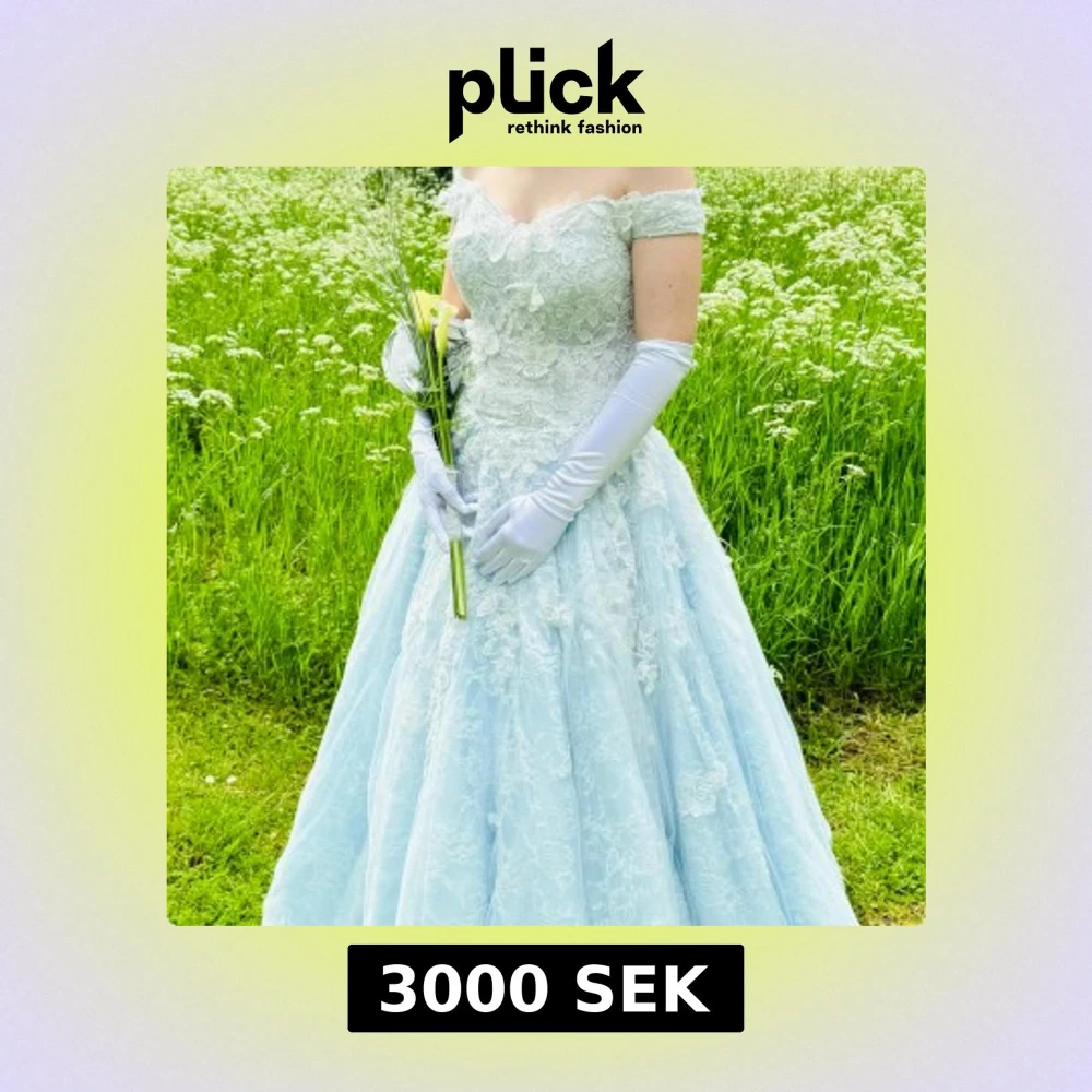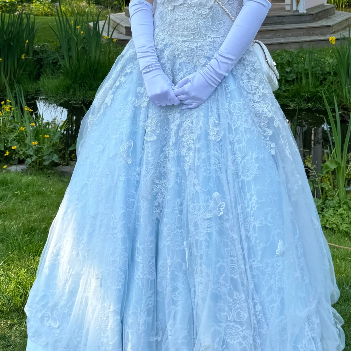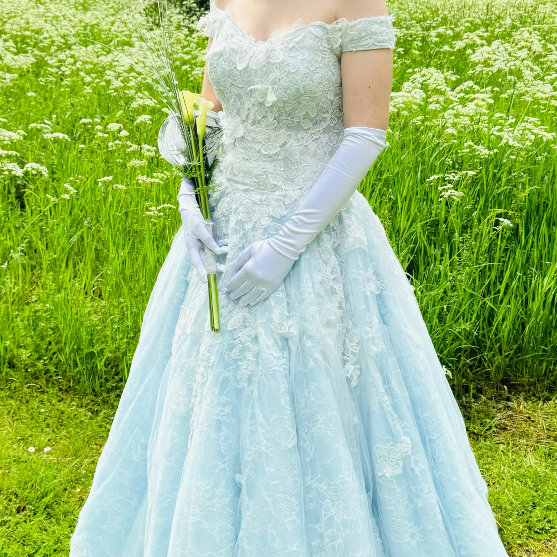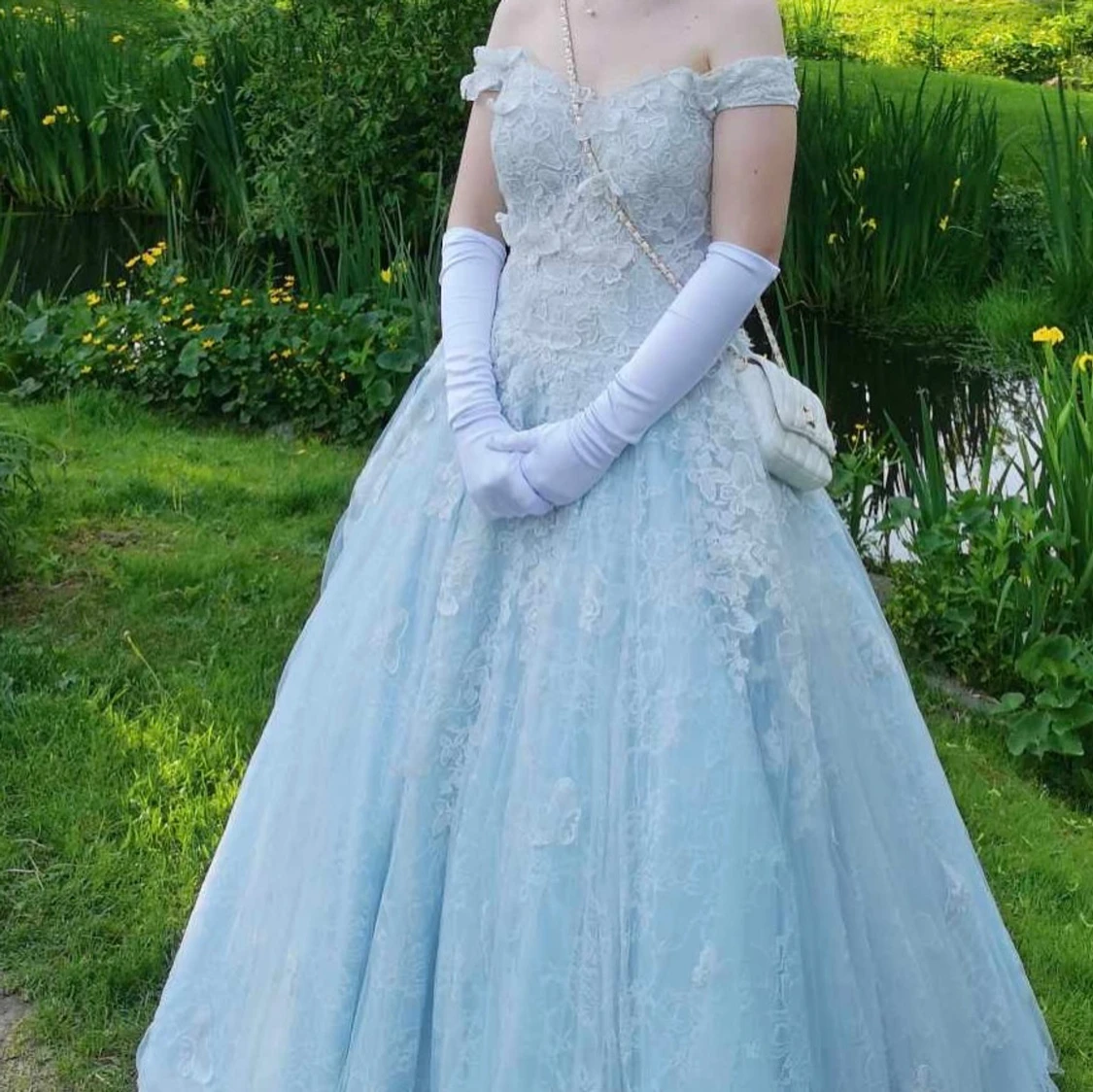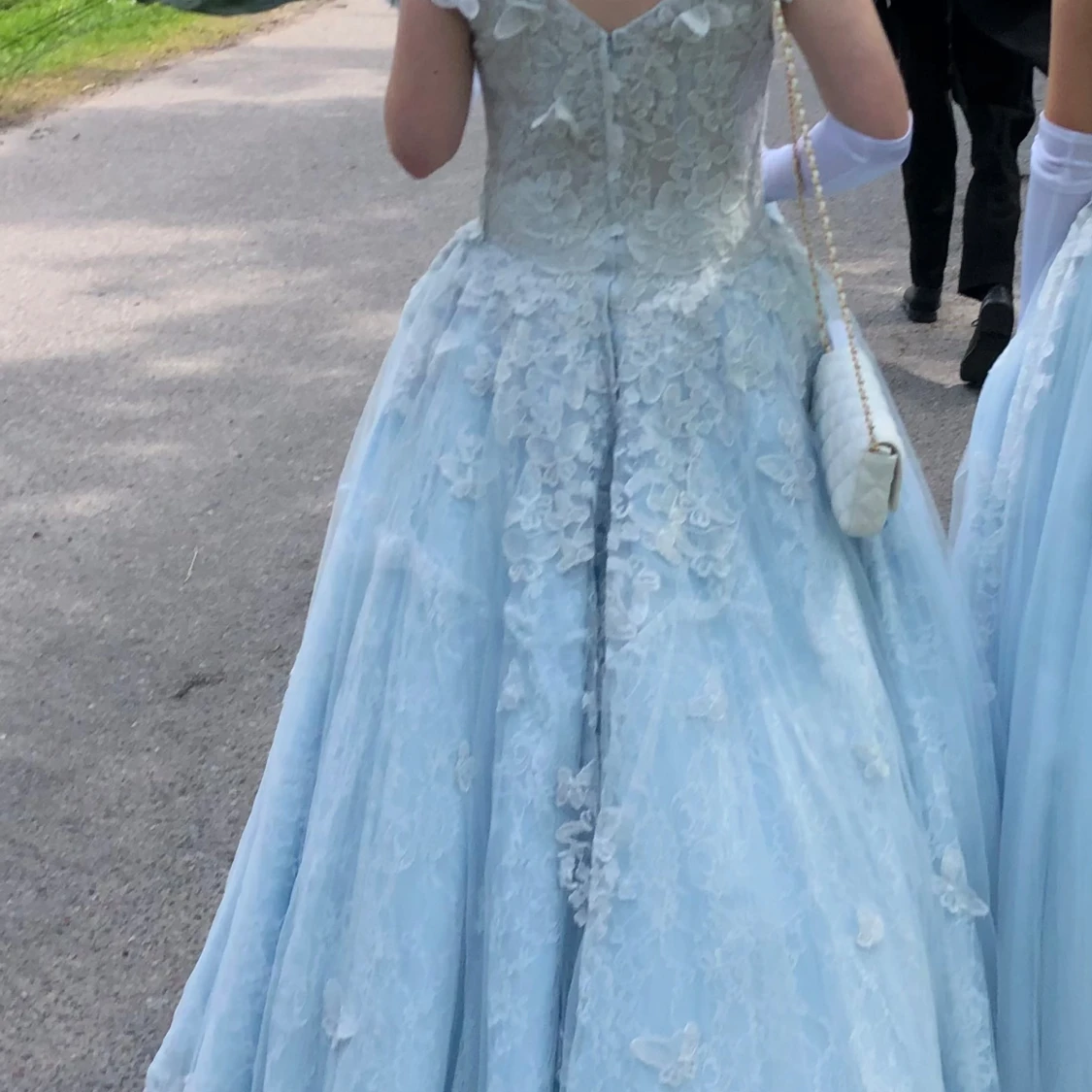 Superfin ljusblå balklänning med offshoulder och vacker spets över hela klänningen. Perfekt för bal! Med klänningen ingår underkjol och handskar. Köpt begagnad för 4900 men säljer för 3000. Klänningen är insydd och passar någon som har stl 34/36. Jag är 174 cm lång.