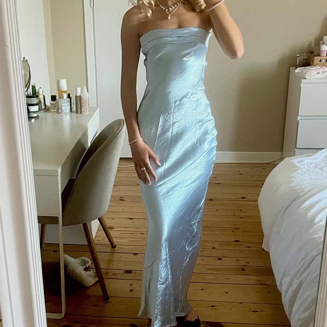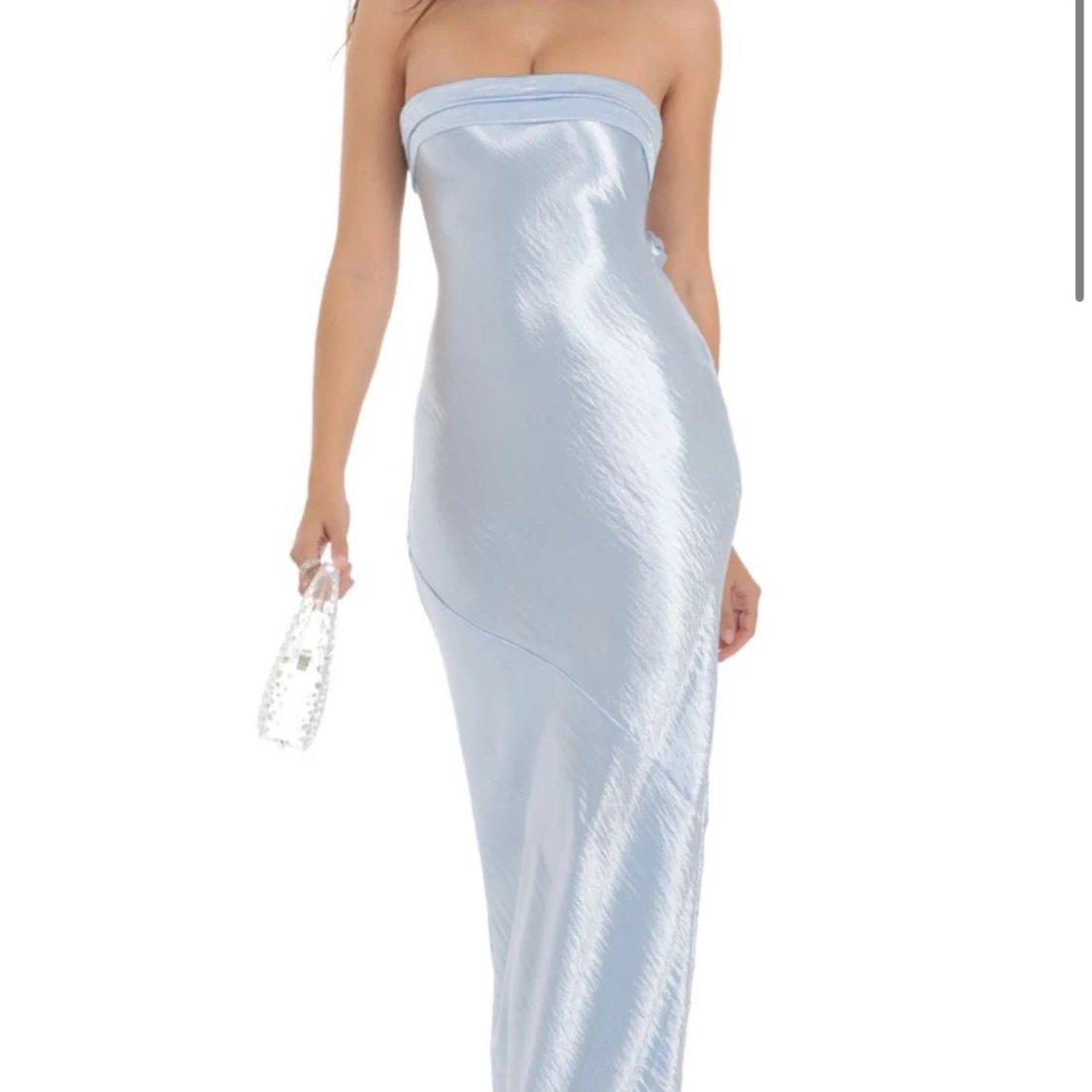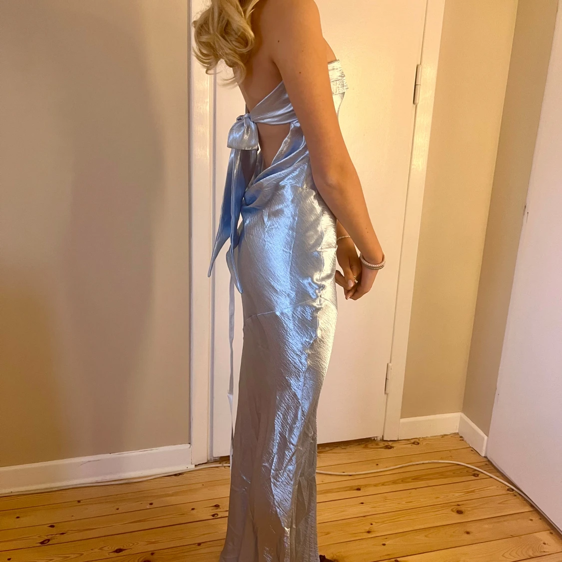 Säljer världens finaste ljusblåa satin klänning med öppen rygg ifrån Lucy in the sky🩵 den är aldrig använd och har alla lappar kvar. Köptes för 1050kr inklusive tull. Jag är 172 för referens och klänningen går ner till fötterna!