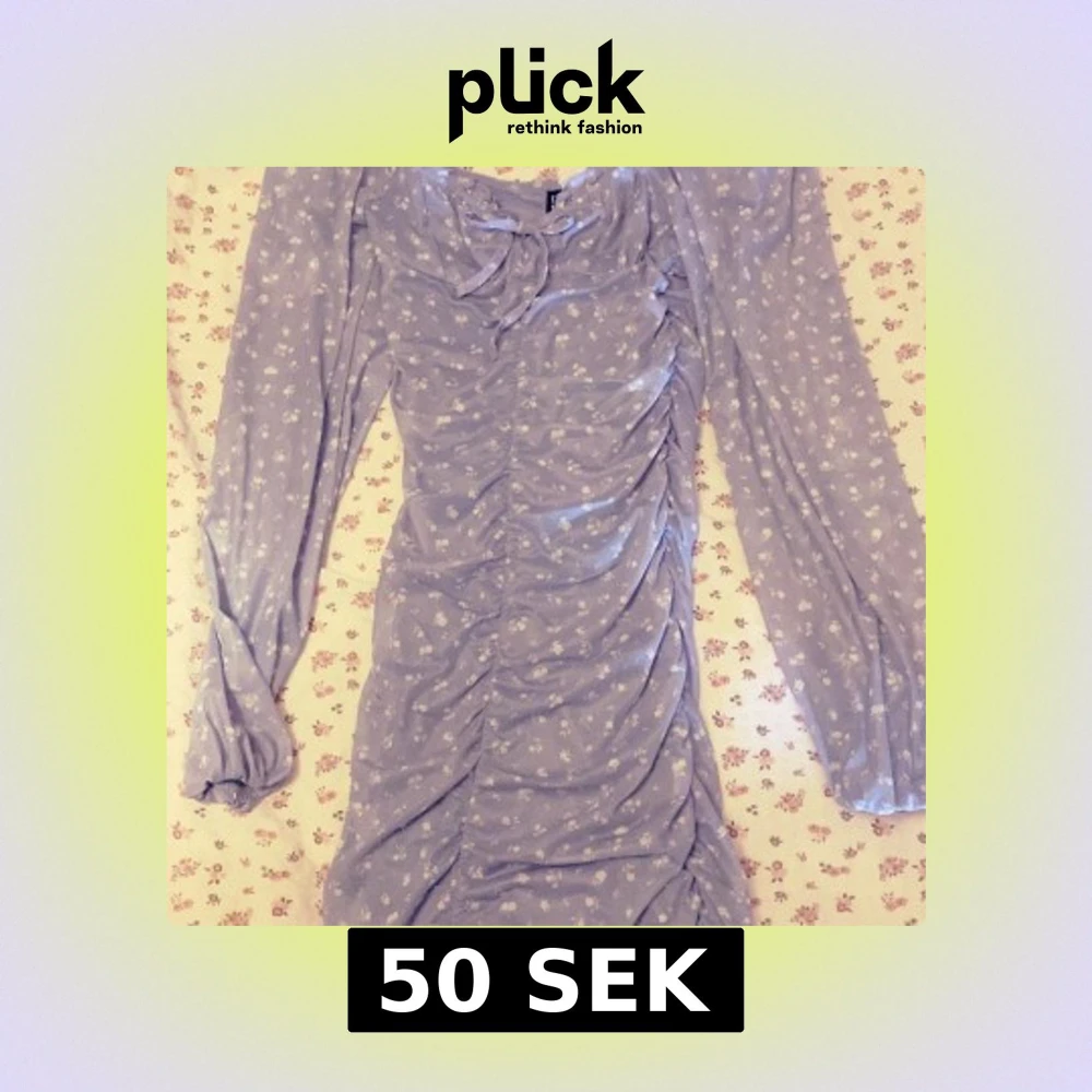 Supersöt ljusblå klänning från H&M med små vita blommor, långa genomskinliga ärmar och snygg rynkdetalj framtill. Har en rosett vid bröstet som man kan se på bilden , lätt material som passar perfekt till vår och sommar. Använd endast en gång.