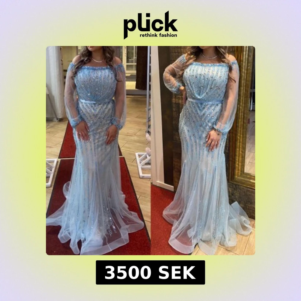 Elegant ljusblå långklänning med glittriga detaljer och offshoulder-design. Klänningen har långa, transparenta ärmar och en smickrande passform med ett bälte i midjan. Perfekt för speciella tillfällen.