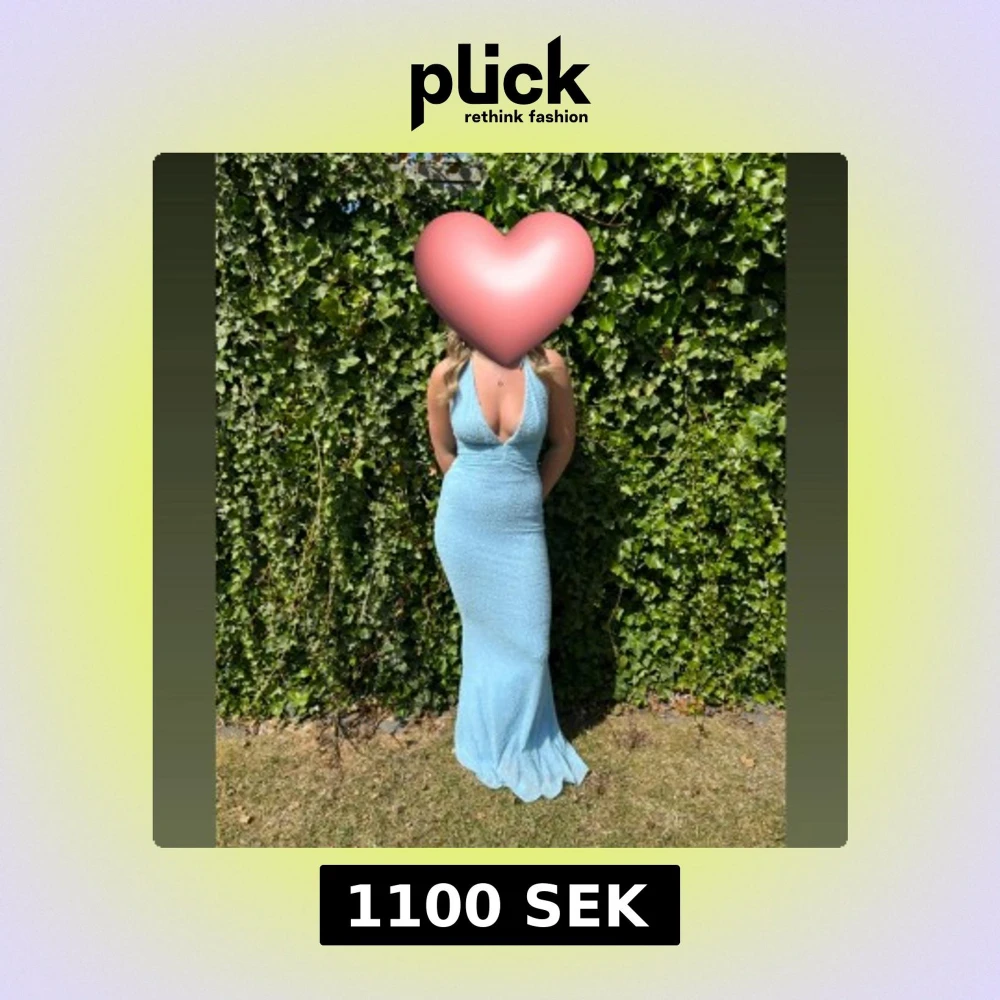 Supersnygg ljusblå långklänning med glittrigt tyg och djup v-ringning. Klänningen är figurnära, har öppen rygg och är ärmlös. Perfekt för bal eller student! Materialet är stretchigt och skimrar fint i ljuset.