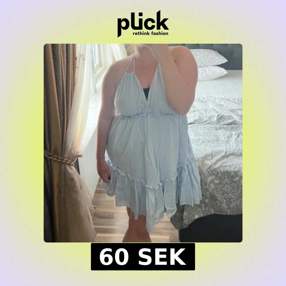 Supersöt ljusblå kortklänning med halterneck och volangkant nertill. Klänningen har smock i ryggen och knyt i nacken för en bekväm passform. Den har en liten fläck på framsidan av klänningen men försvinner säkert med vanish. Använd en gång.