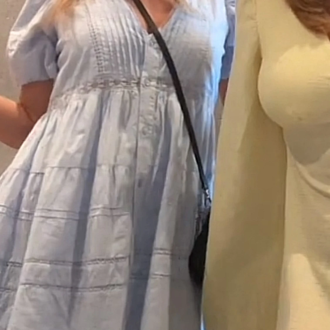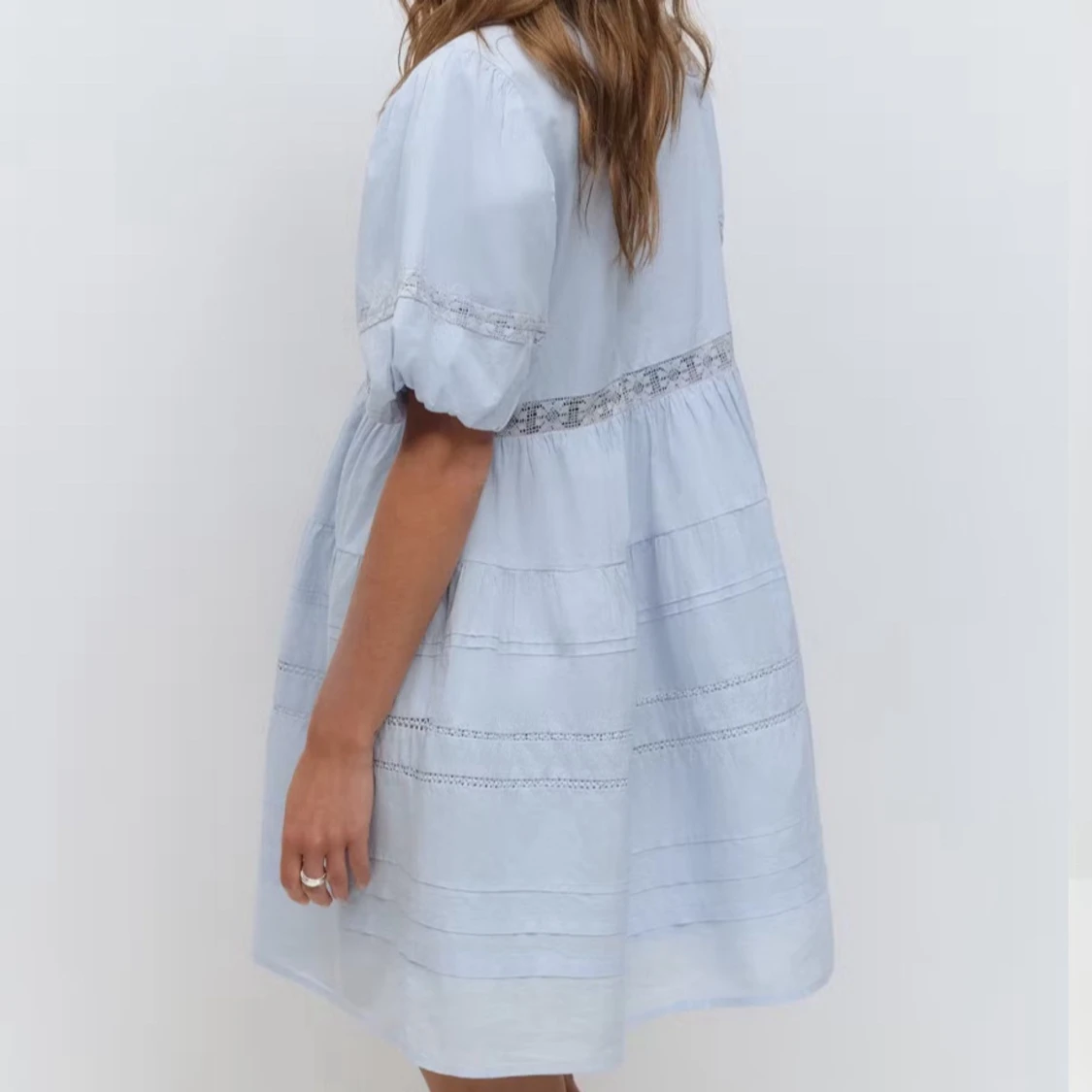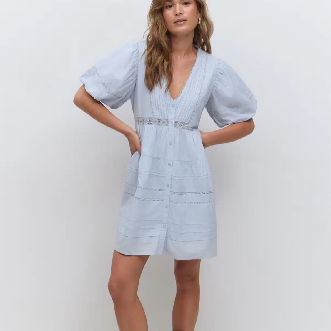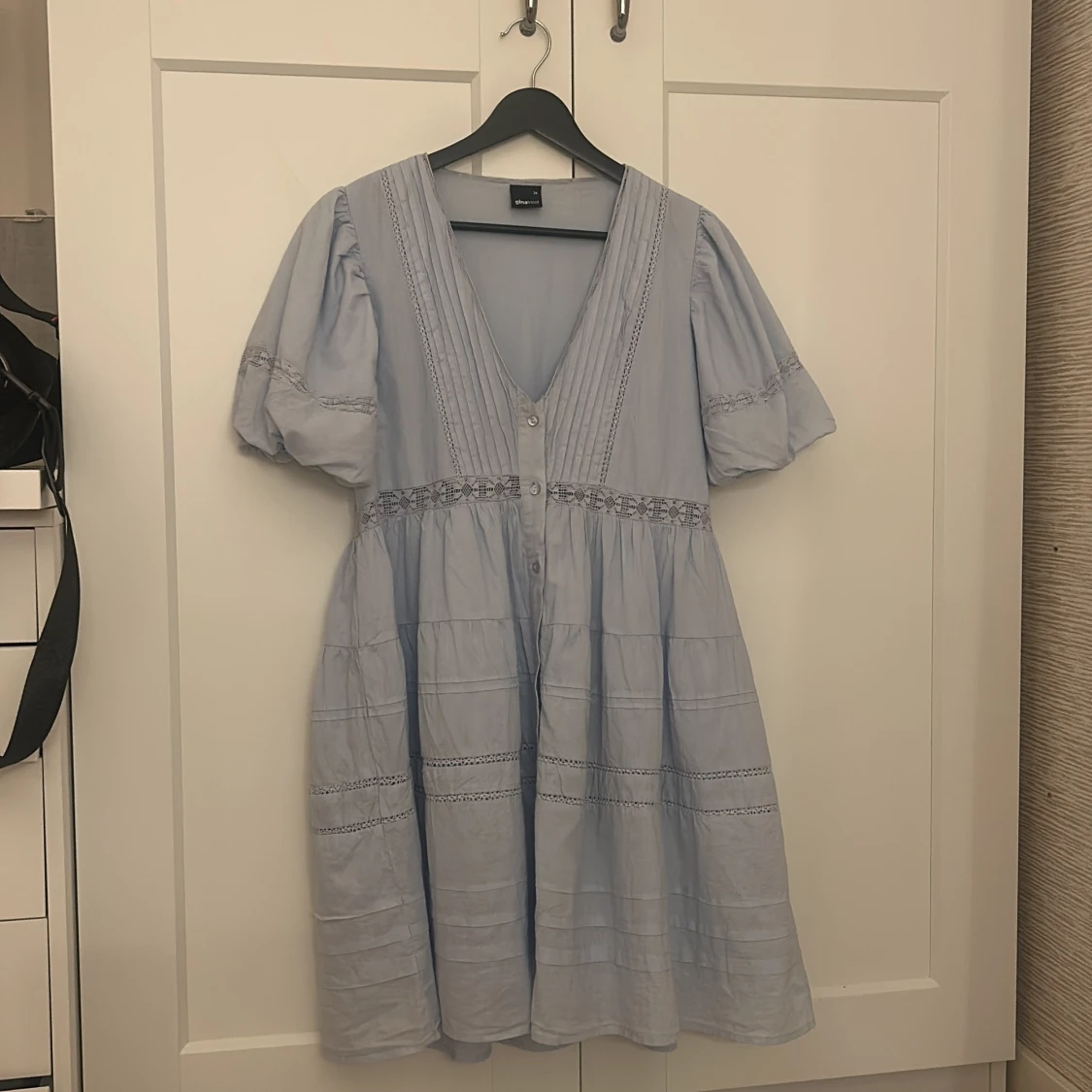 Supersöt ljusblå klänning från Gina Tricot med v-ringning, puffiga korta ärmar och spetsdetaljer vid midjan och på kjolen. Knäppning framtill och luftig passform som ger en chill vibe. Perfekt för varma dagar och har en romantisk look. Den är i bra skick och bara använd en gång. Säljer då jag känner att jag inte har nytta av den!