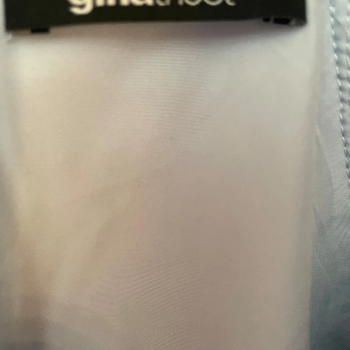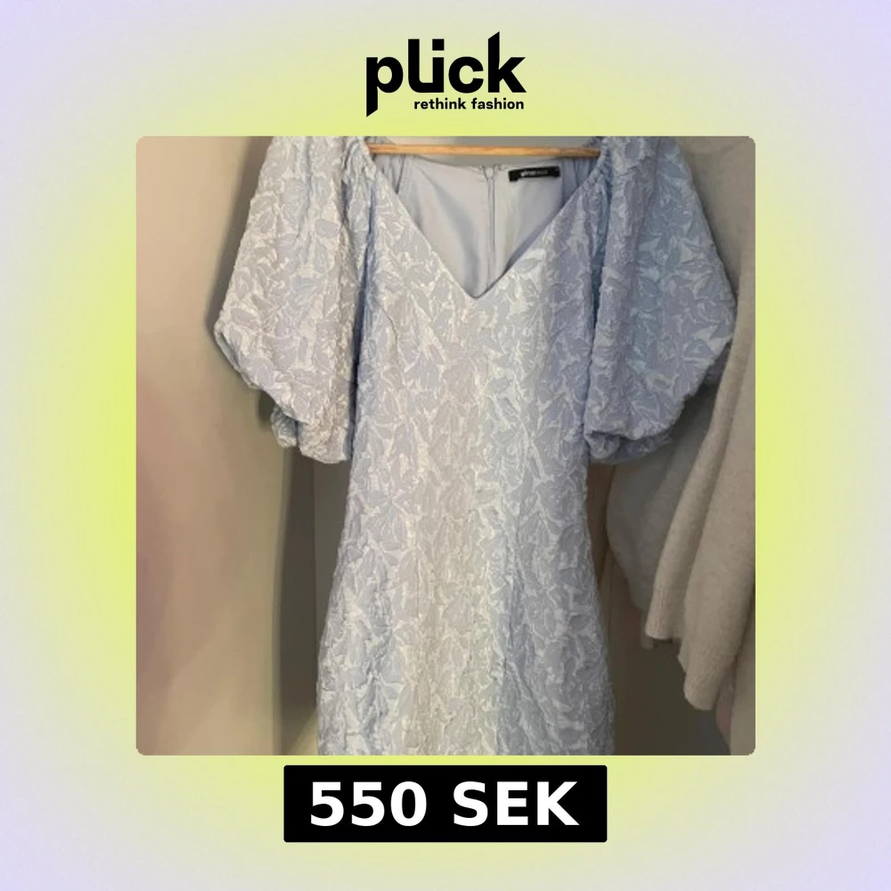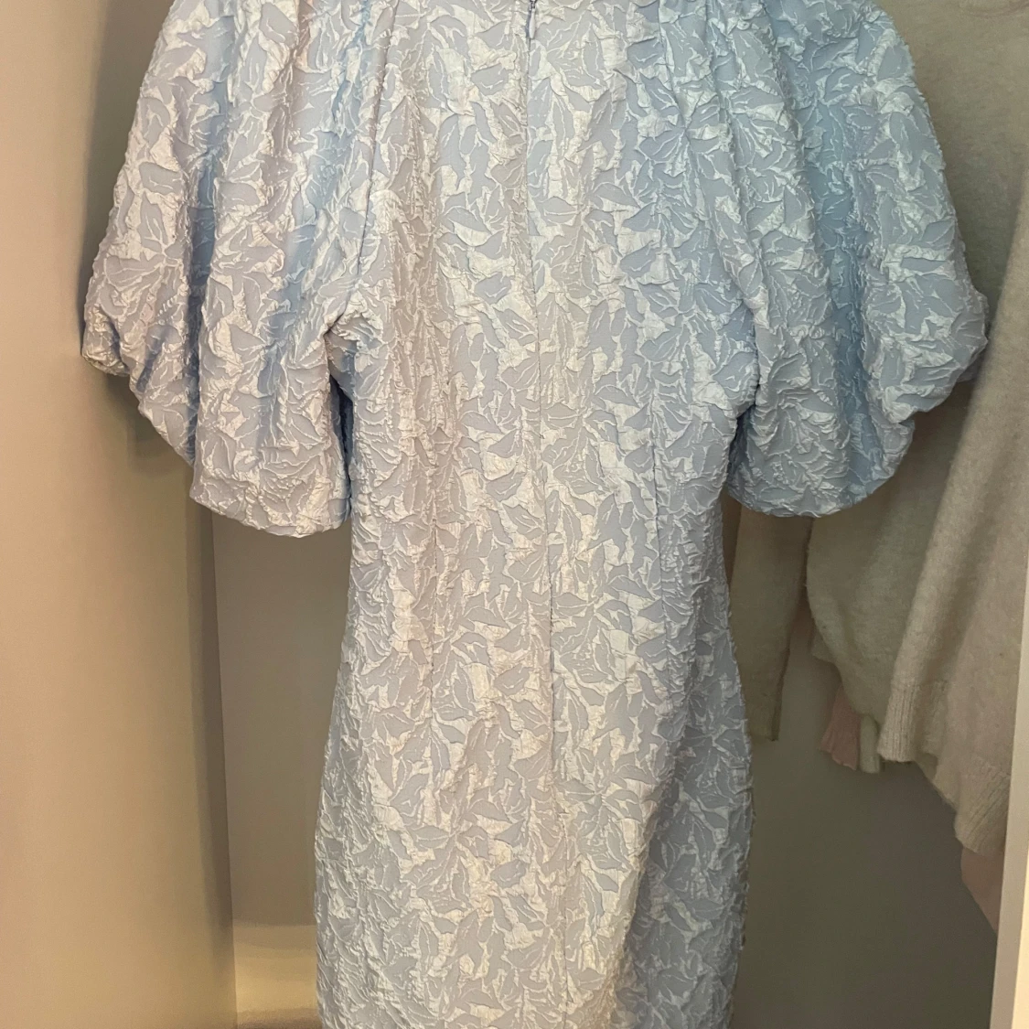 Supersöt ljusblå kort klänning från Gina Tricot med puffiga korta ärmar och v-ringning. Klänningen har ett blommigt strukturmönster i tyget och dragkedja bak. Bara använd en gång och storlek 34/Xs Skriv privat för mer frågor💗