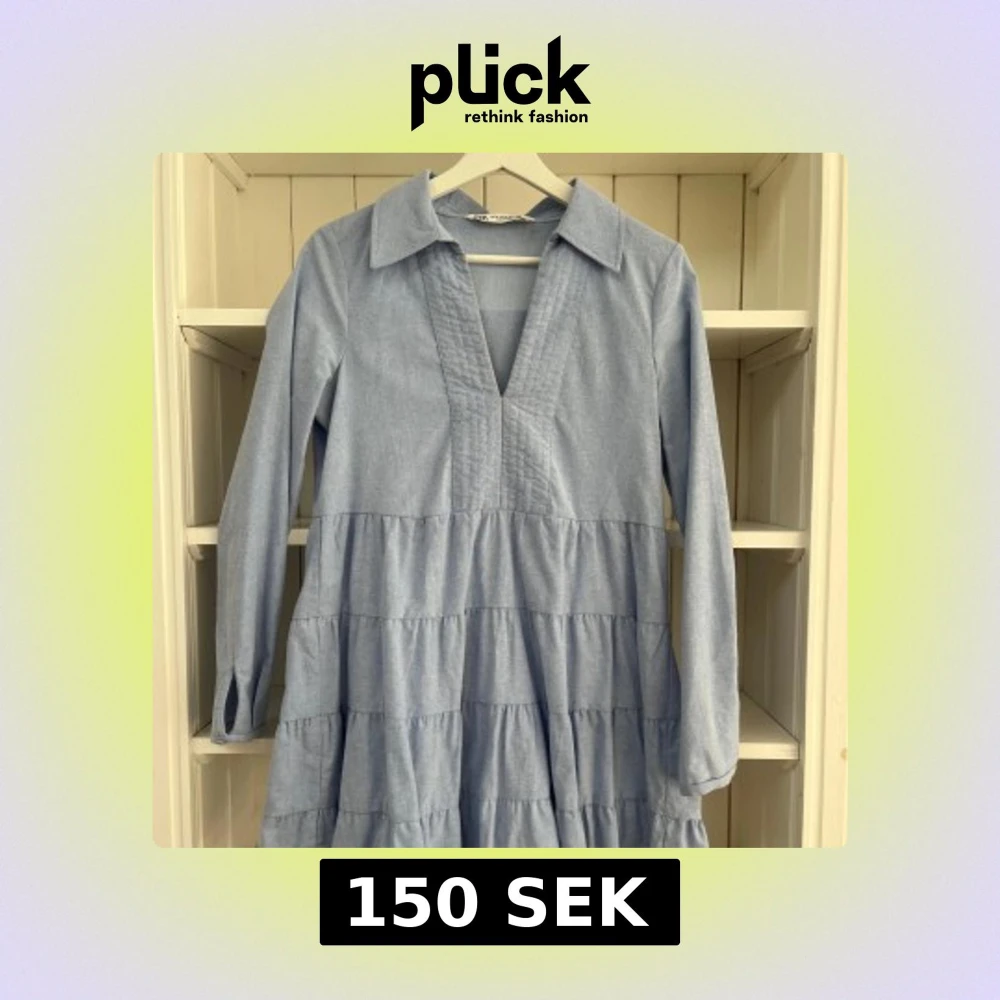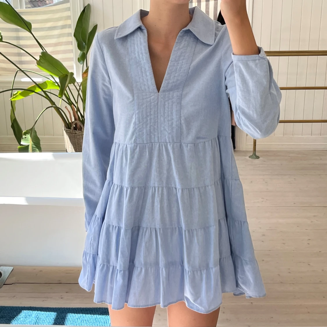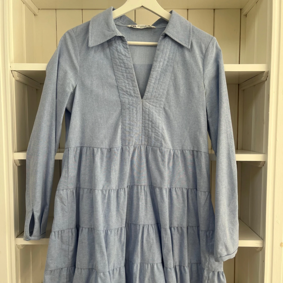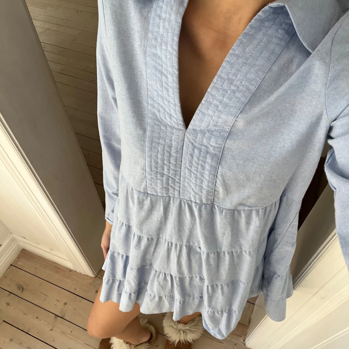 Supersöt v-ringad ljusblå klänning från Zara med volanger och lång ärm.