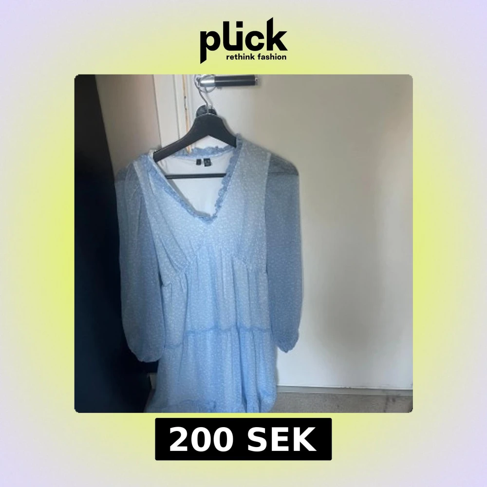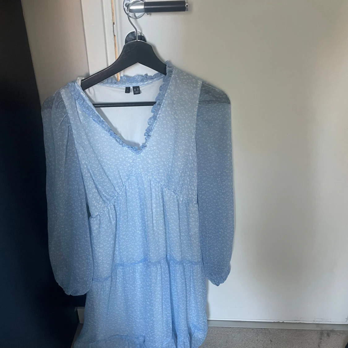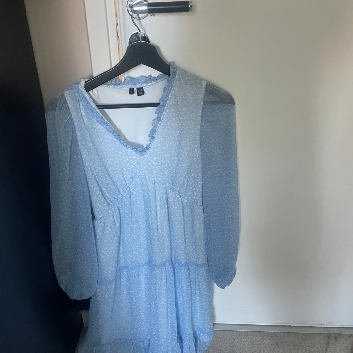 Supersöt ljusblå kortklänning från veromoda med små vita prickar, v-ringning med volangkant och långa, transparenta ärmar. .