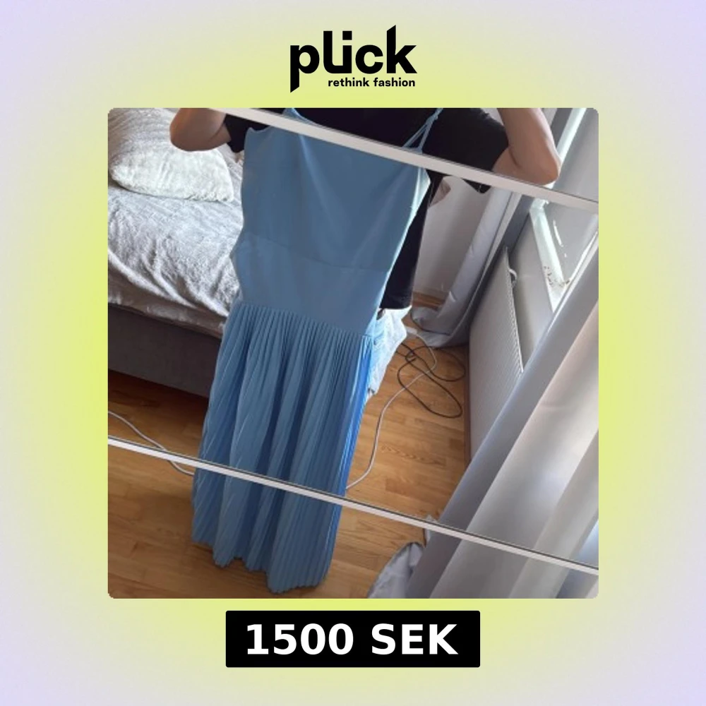 Superfin ljusblå långklänning med smala axelband och plisserad kjol. Klänningen har en enkel, stilren överdel och ett flowy fall som känns riktigt somrigt. Perfekt för dig som vill sticka ut med en fräsch färg och snygg siluett.