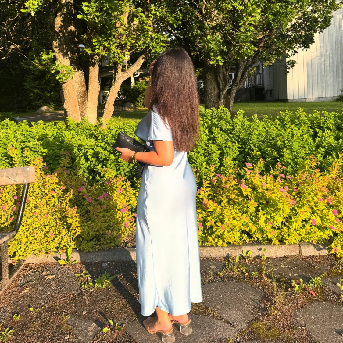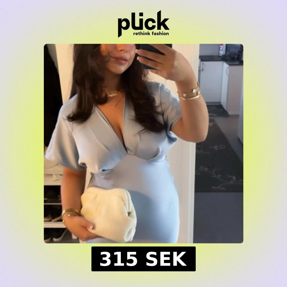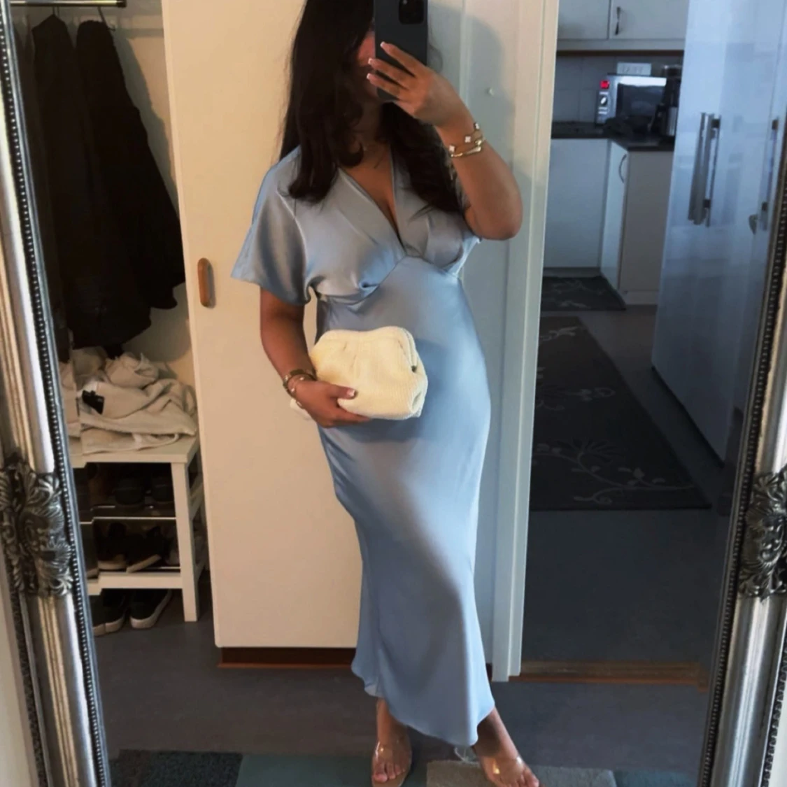 Superfin ljusblå långklänning i satin med v-ringning och korta ärmar ifrån ZARA. Klänningen har en elegant omlottkänsla upptill och faller snyggt längs kroppen. Perfekt för dig som vill ha en stilren och trendig look till sommaren, balen, bröllop eller event. St L men passar mig som vanligtvis bär M. Är 159cm.