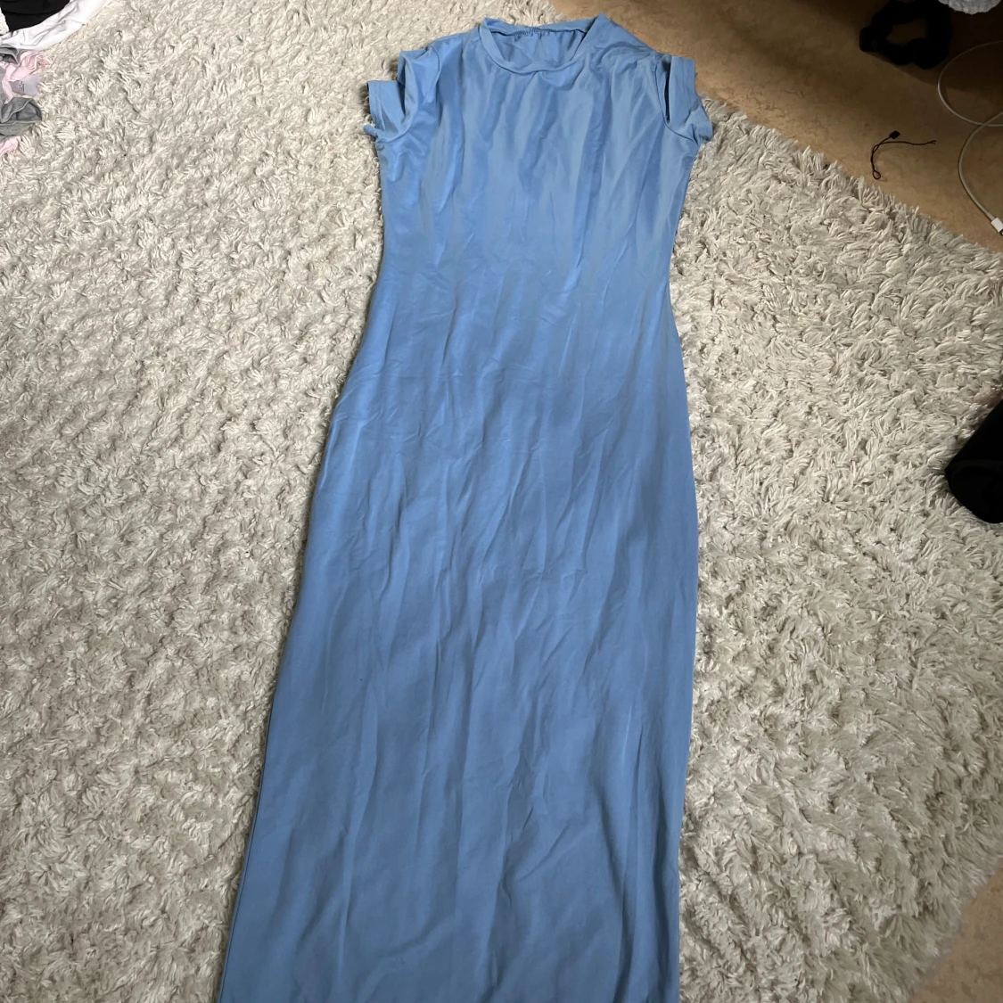 Enkel och stilren ljusblå långklänning med korta ärmar och rund halsringning. Klänningen har en rak passform och är tillverkad i ett mjukt, tunt material som känns skönt mot huden. Perfekt för varma dagar eller när du vill ha en clean look.