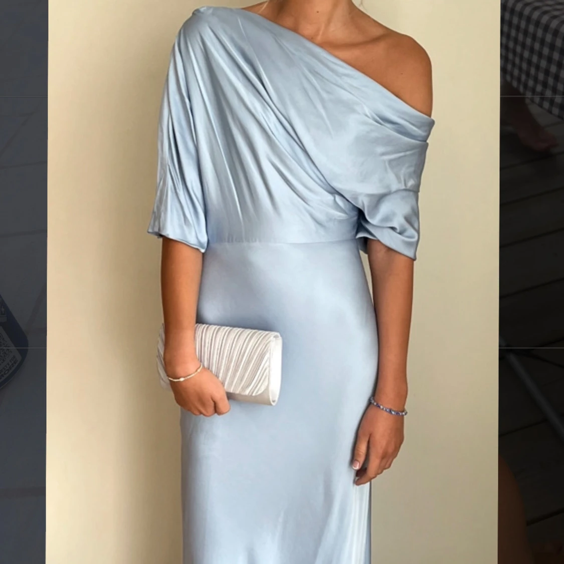 Säljer här min super fina ljusblåa balklänning i satin. Klänningen har en snygg oneshoulder-design med kort ärm på ena sidan och en slät, figurnära passform som faller mjukt längs kroppen. Klänningen är ifrån Malina och jag köpte den för 3600 kr, använd en gång och ser ut som ny💙
