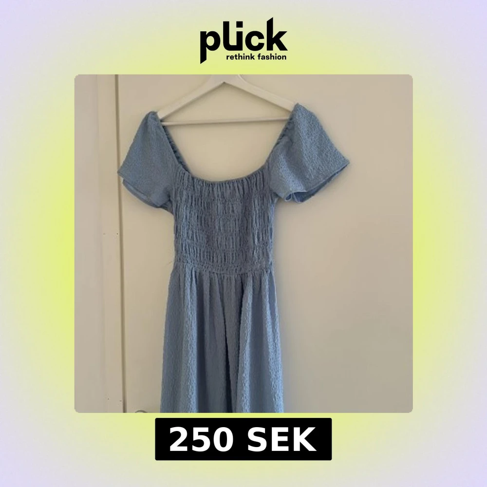 Superfin ljusblå långklänning med smockad överdel och vida puffärmar. Klänningen har en kjol med volang nertill. Storlek 34 men passar nästan bättre på 36. Använd en gång🩵