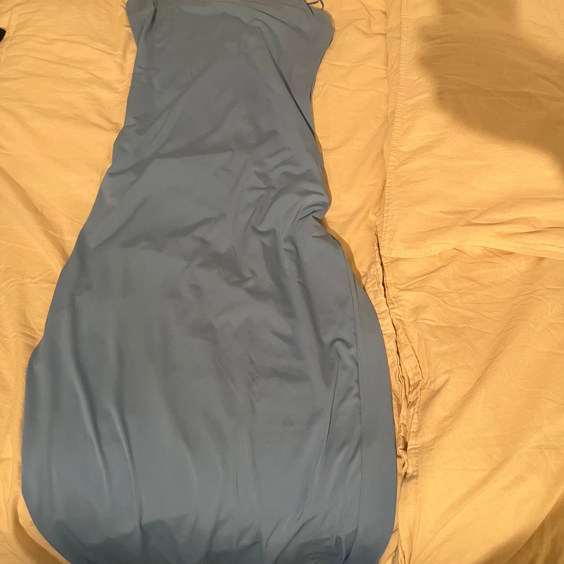 Säljer en stilren ljusblå långklänning med smala axelband. Klänningen har en enkel och elegant design, perfekt för dig som gillar minimalistisk stil. Materialet känns mjukt och följsamt mot kroppen.