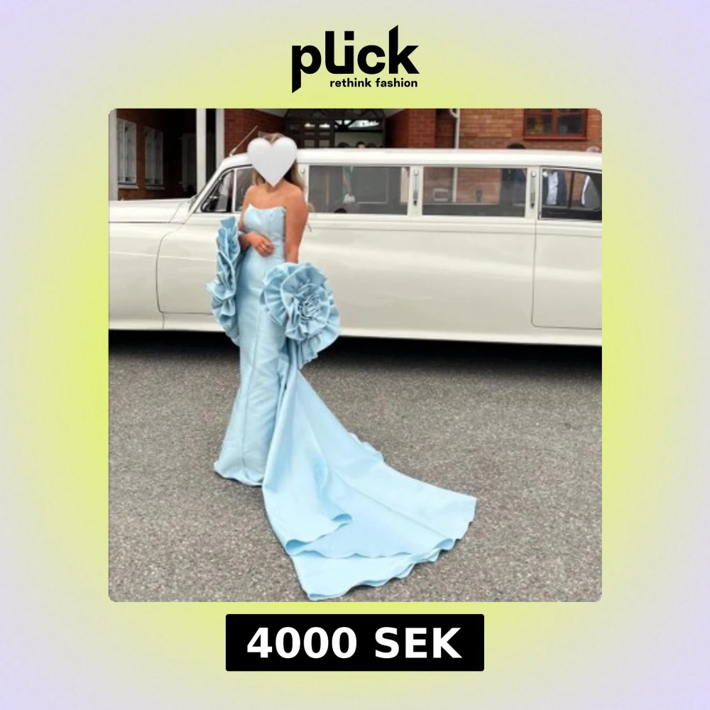 Unik ljusblå långklänning med spektakulära rosdetaljer på sidorna och ryggen. Klänningen är axelbandslös och har en dramatisk släp som ger extra wow-effekt. Ord.pris 9000kr