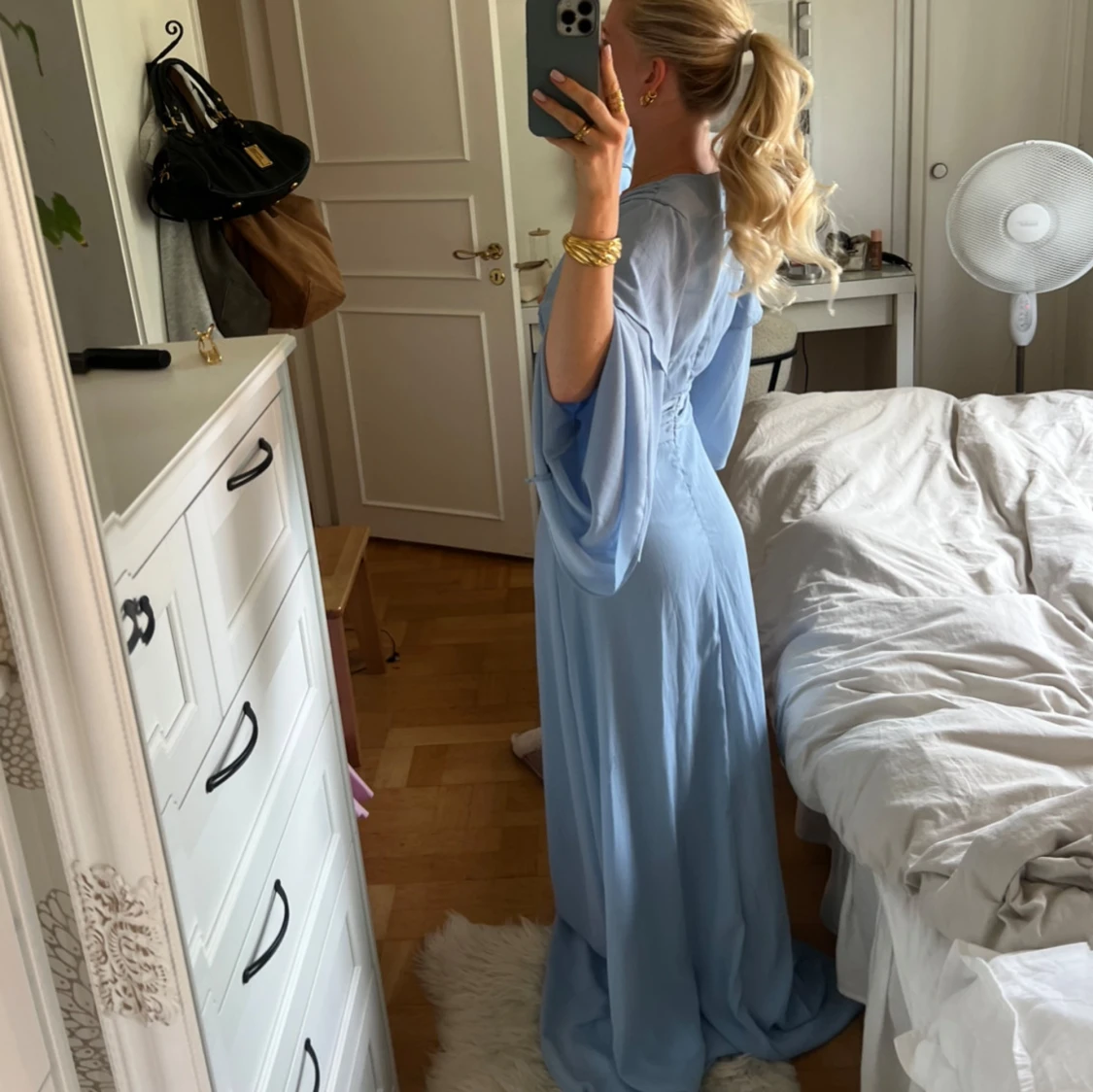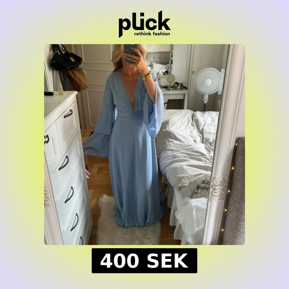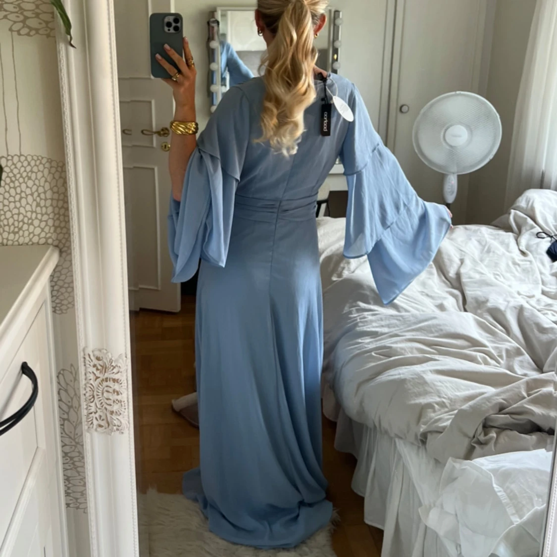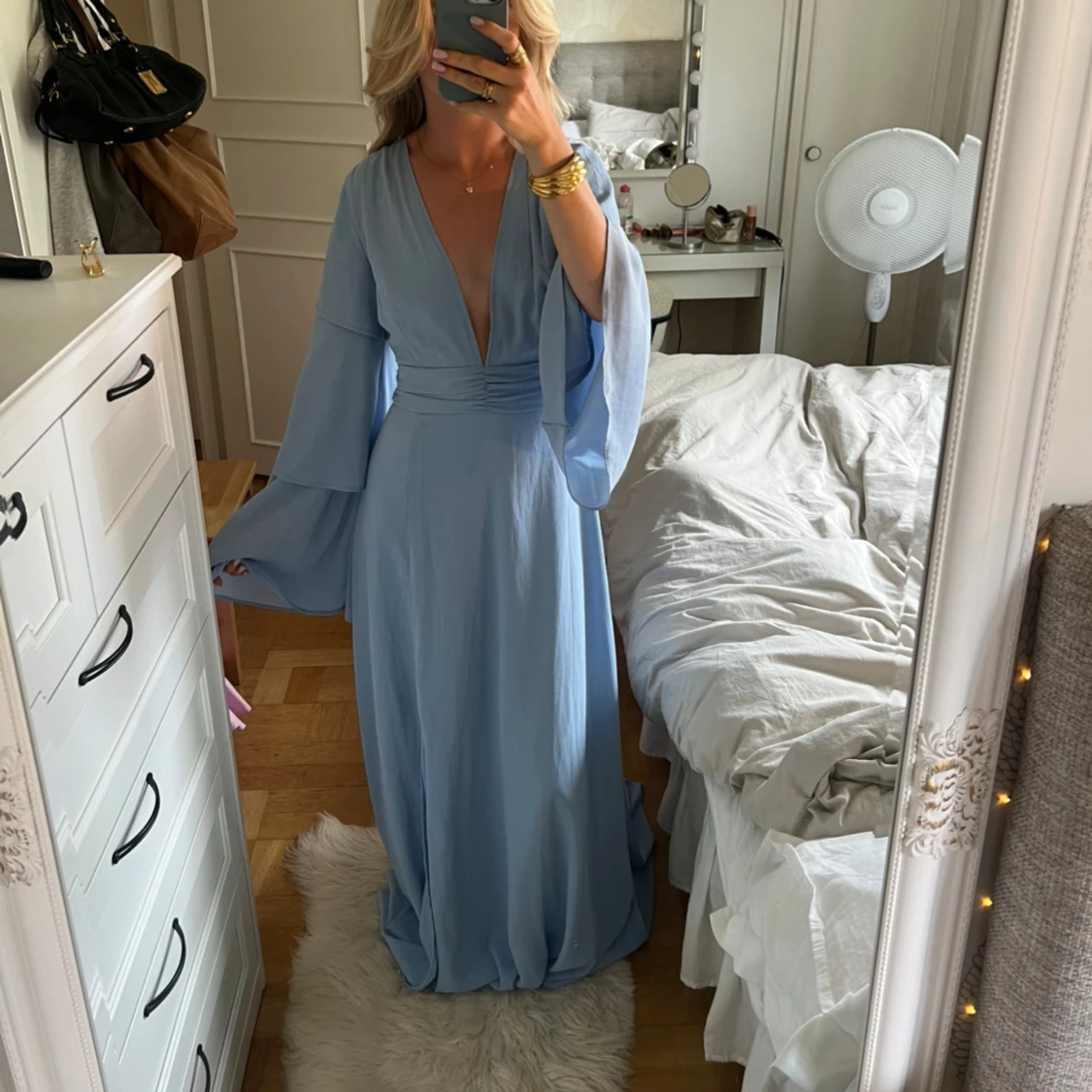 Superfin ljusblå långklänning med djup v-ringning, markerad midja och vida, flowiga ärmar. Klänningen har en slits framtill och är perfekt för bal, bröllop eller andra festligheter!😍 för lång på mig som är ca 165 cm och lite stor i bysten på mig med liten byst.💞 oanvänd, lappen sitter kvar.