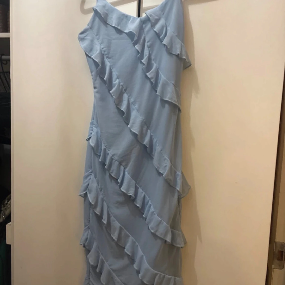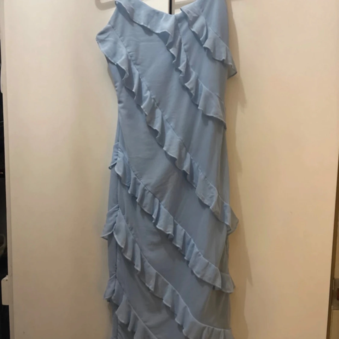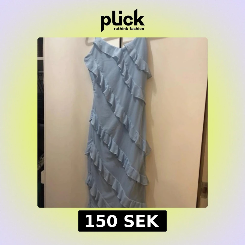 Säljer en ljusblå långklänning med offshoulder-design och flera diagonala volanger som ger en cool och romantisk vibe. Klänningen har en flowy passform och är perfekt för sommarens alla tillfällen. Materialet känns lätt och luftigt.