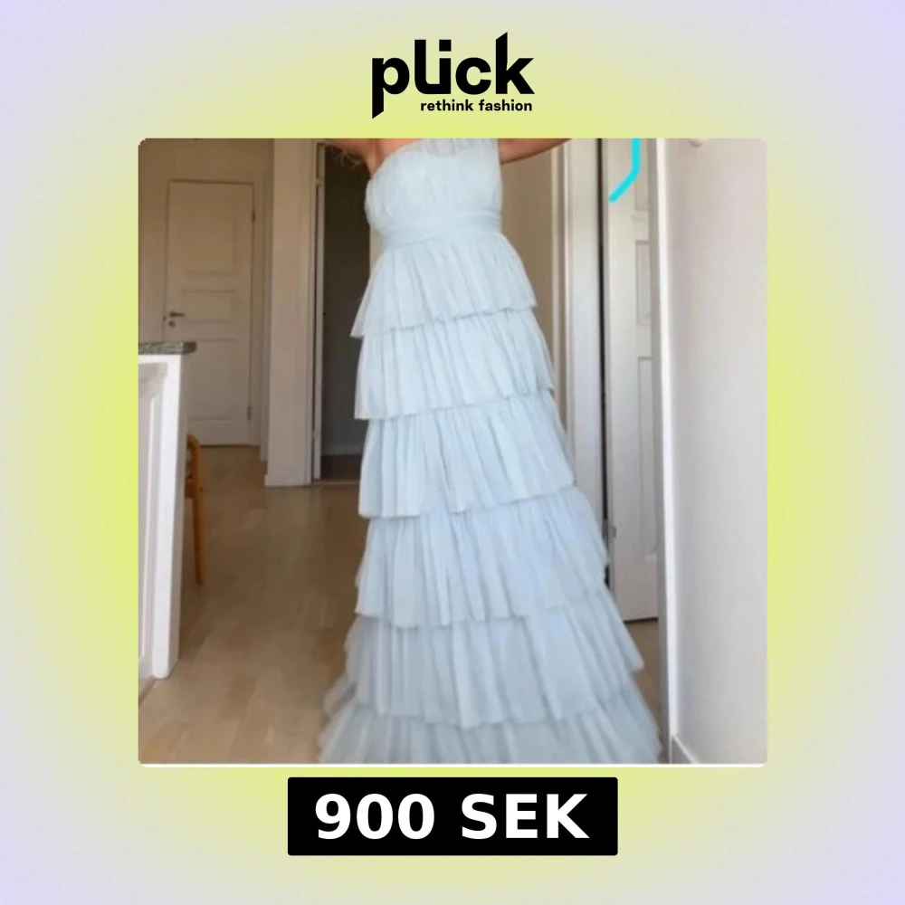 Säljer en drömmig ljusblå långklänning med flera lager volanger och oneshoulder-modell. Klänningen har en romantisk känsla och är sydd i ett tunt, skirt material som ger ett svävande intryck.