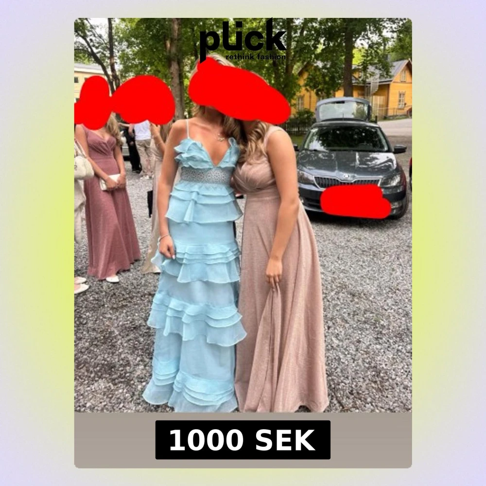 Supersnygg ljusblå långklänning från True Decadence med tunna axelband, volanger i flera lager och spetsdetaljer i midjan. Några fläckar på insidan och ett påsytt tyg för att undertyget ska bli längre (se bilder)