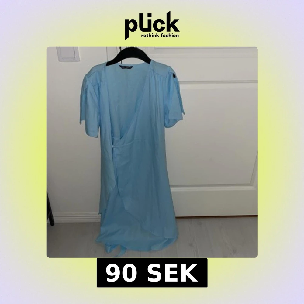 Snygg ljusblå omlottklänning med kortärmad design och v-ringad hals. Perfekt för sommarens varma dagar.