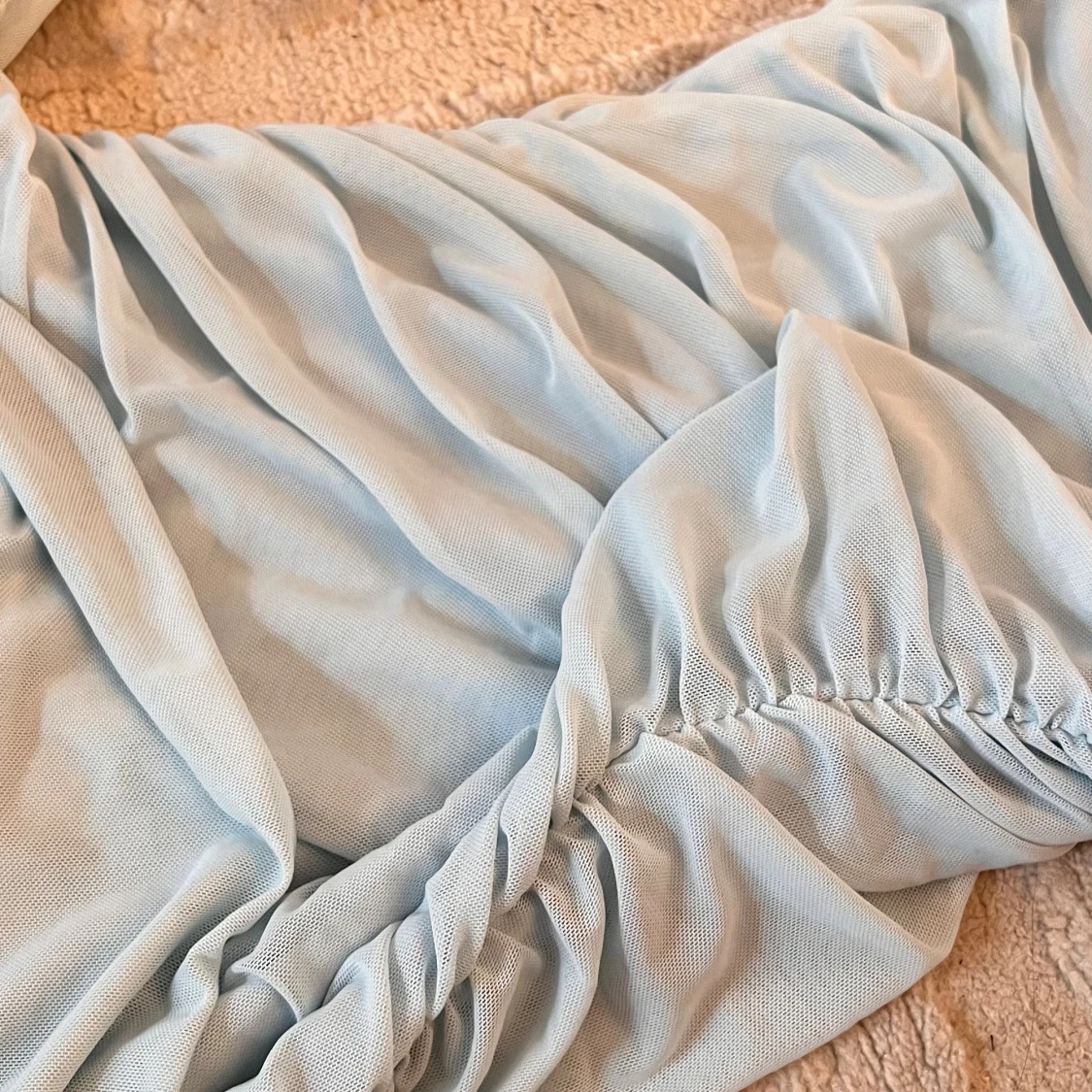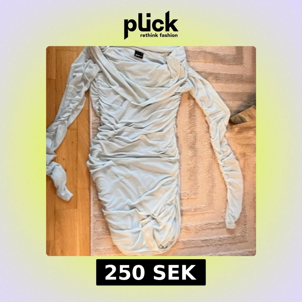 Säljer en ljusblå kortklänning från Gina Tricot med snygg omlottkrage och rynkade detaljer längs hela klänningen. Materialet är mjuk mesh med ett tunt foder under. Klänningen har långa ärmar och sitter snyggt figurnära. Perfekt för dig som gillar trendiga och stilrena plagg.