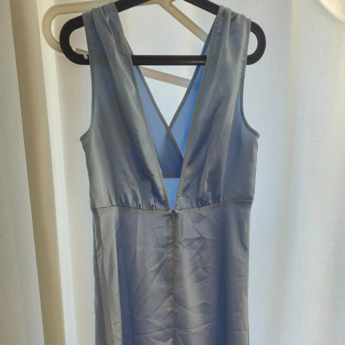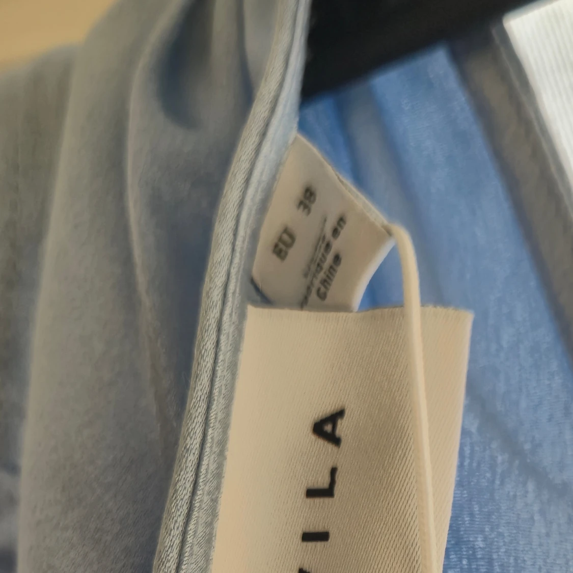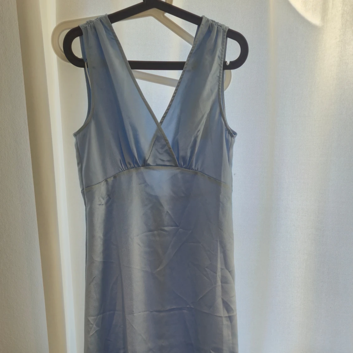 Supersnygg ljusblå klänning från Vila i glansigt satinmaterial. Djup v-ringning både fram och bak, ärmlös och med en smickrande passform. Perfekt för dig som vill sticka ut med en elegant och stilren look.