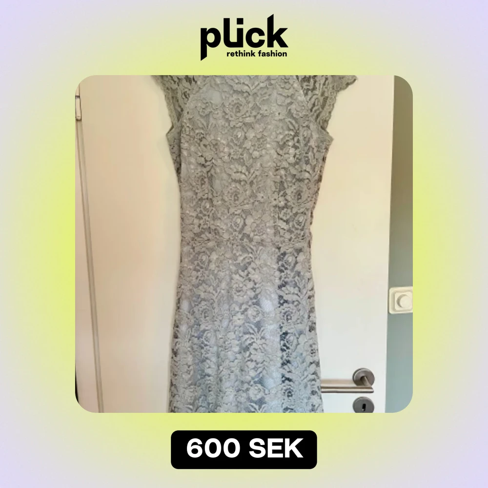 Ljusblå klänning i fransk spets från Valerie. Stl 38. Mkt fint skick, använd 3 gånger. Går till knät för den som är 170 cm. Dragkedja i midjan. Nypris ca 3000.