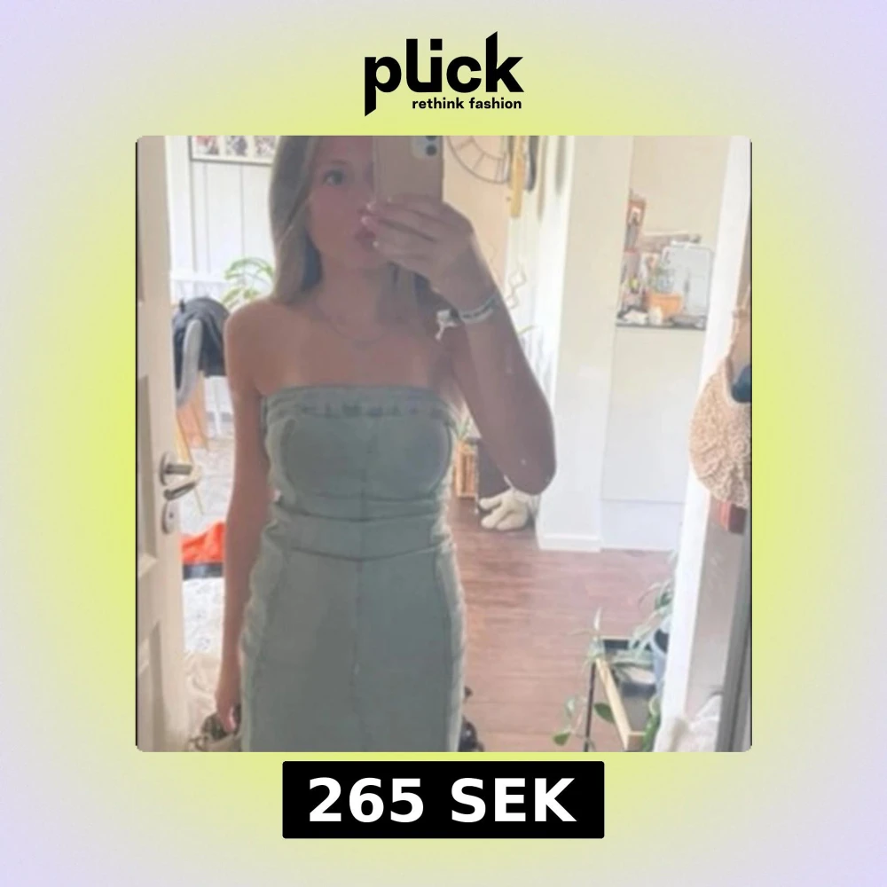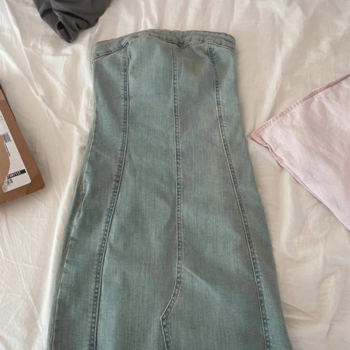 Säljer en snygg ljusblå tubklänning i jeansmaterial från Perfect Jeans. Klänningen är figurnära och har markerade sömmar som ger en cool look. Perfekt för dig som gillar denim och vill ha något unikt i garderoben.