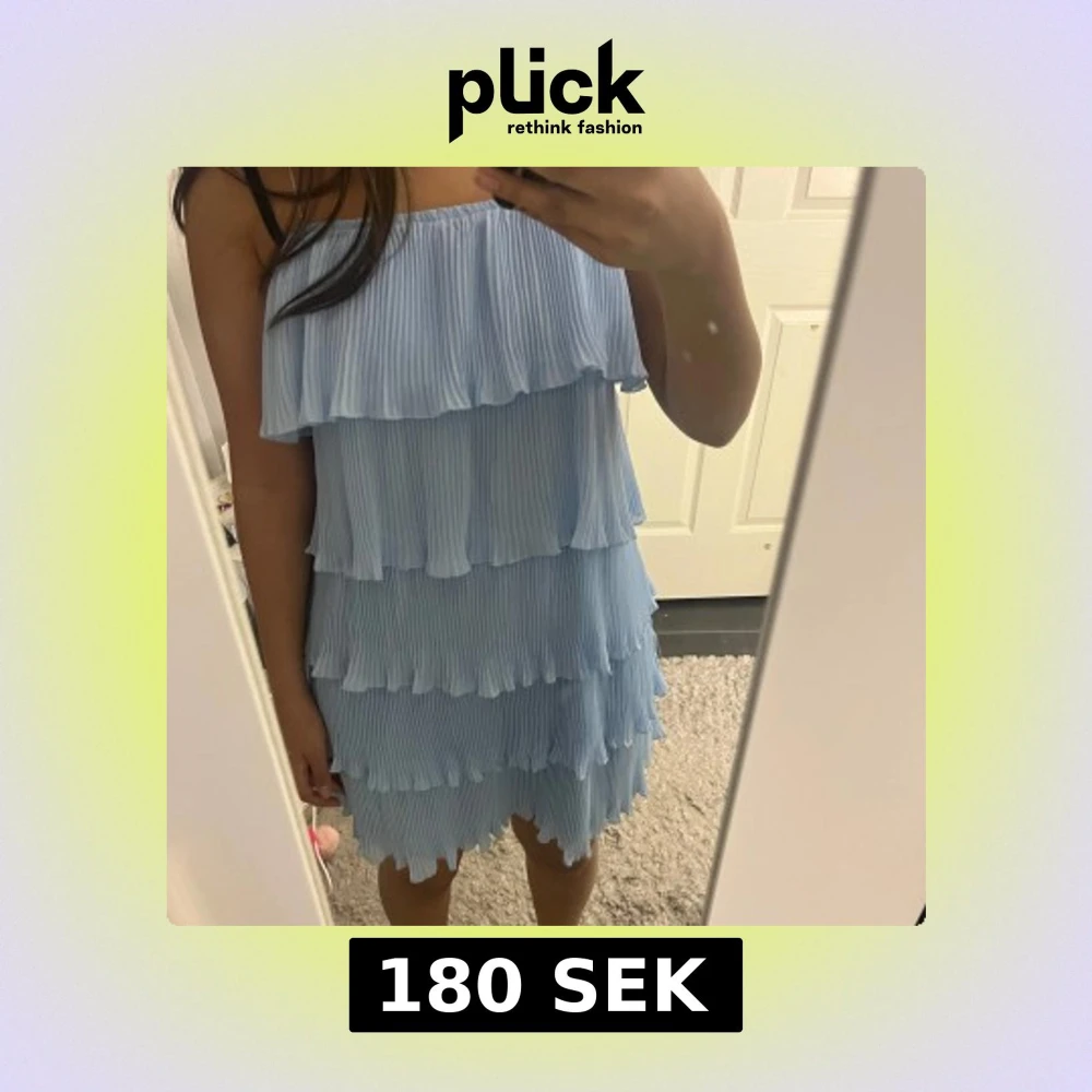 Supersöt ljusblå kortklänning med flera lager volanger och plisserat tyg. Axelbandslös modell som ger en luftig och somrig känsla. Perfekt för dig som vill sticka ut med en feminin och lekfull stil.
