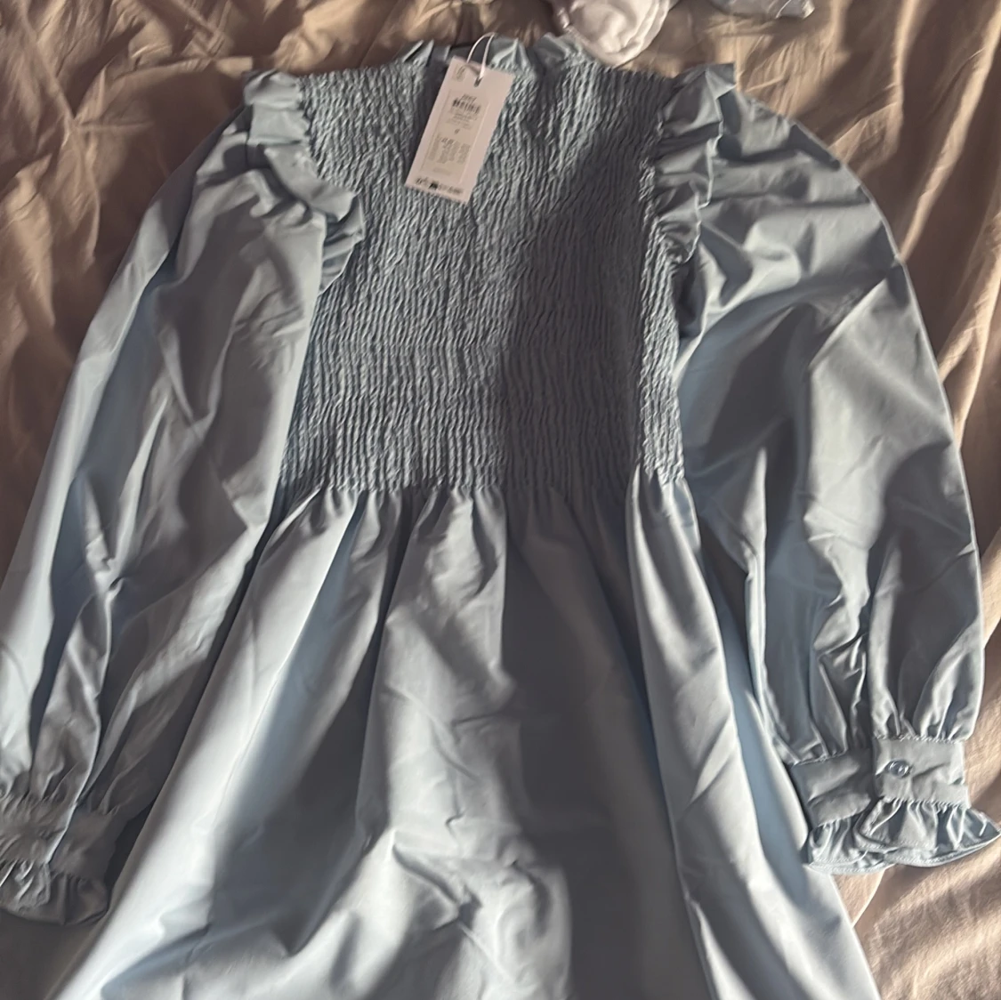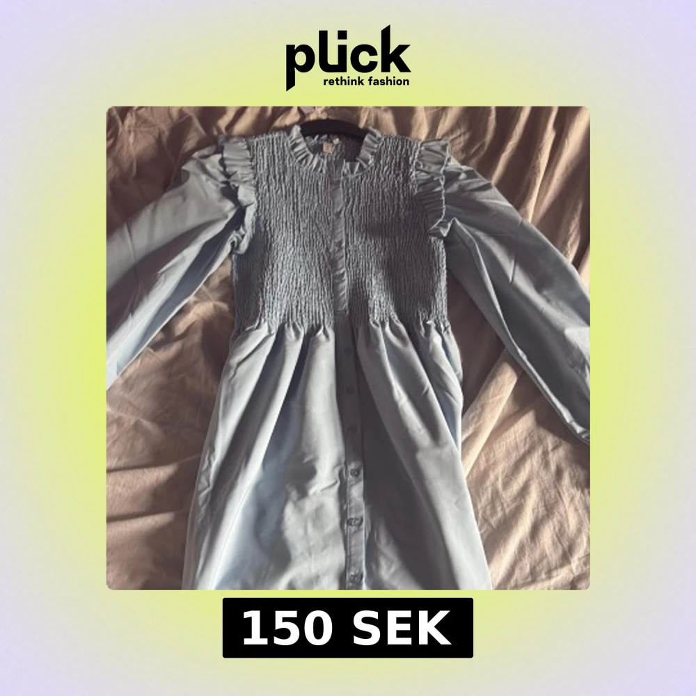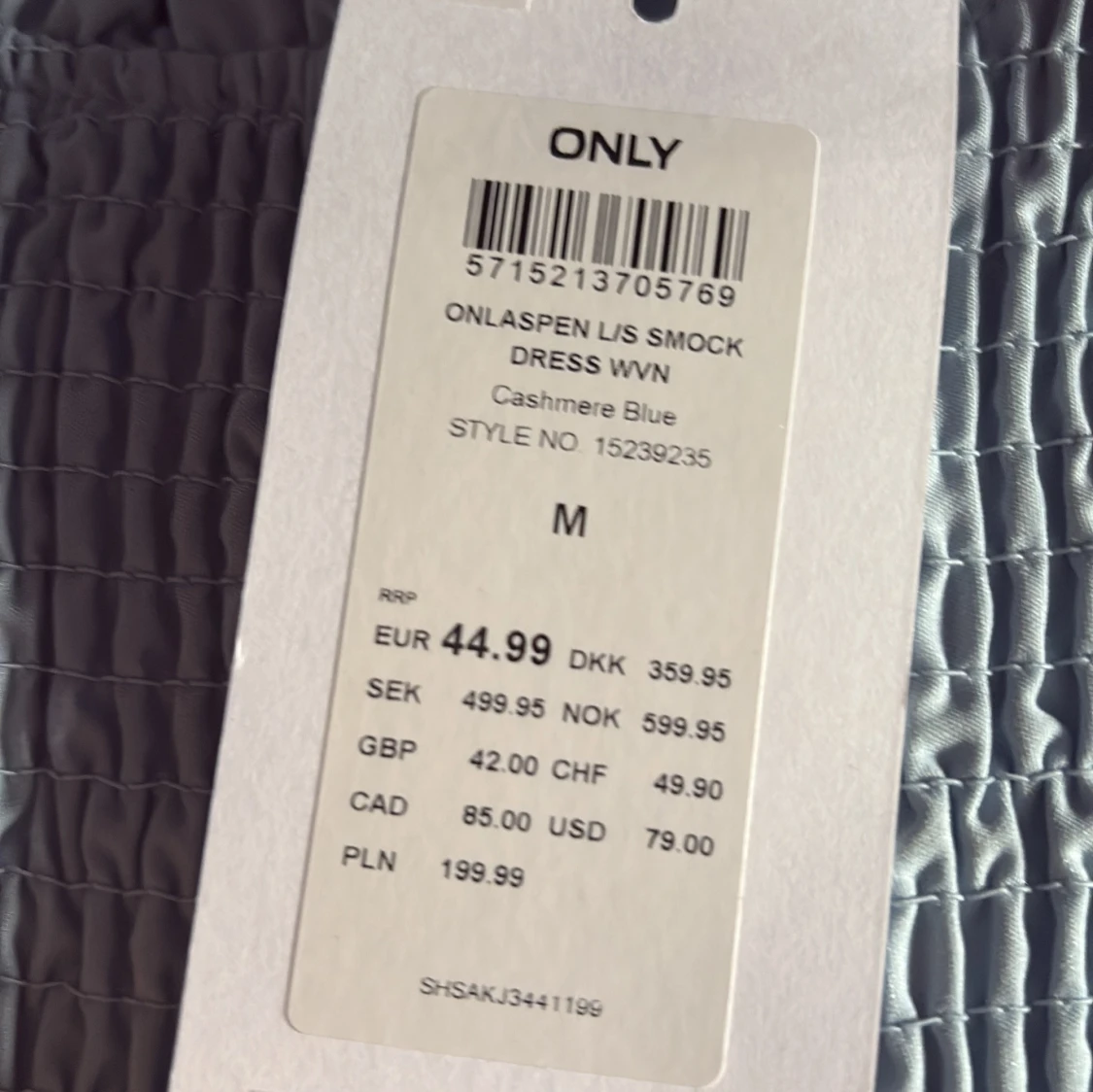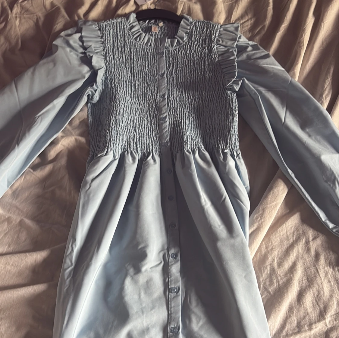 Supersöt ljusblå klänning från ONLY med långa ärmar, volangdetaljer vid axlarna och smockad överdel. Klänningen har knappar framtill och är i ett mjukt, lätt material som känns skönt mot huden. Perfekt för dig som gillar en feminin och trendig stil.