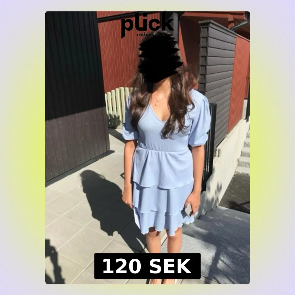 Supersöt ljusblå klänning med v-ringning och trekvartsärm. Klänningen har flera volanglager och en lätt ribbad struktur som ger en extra touch.