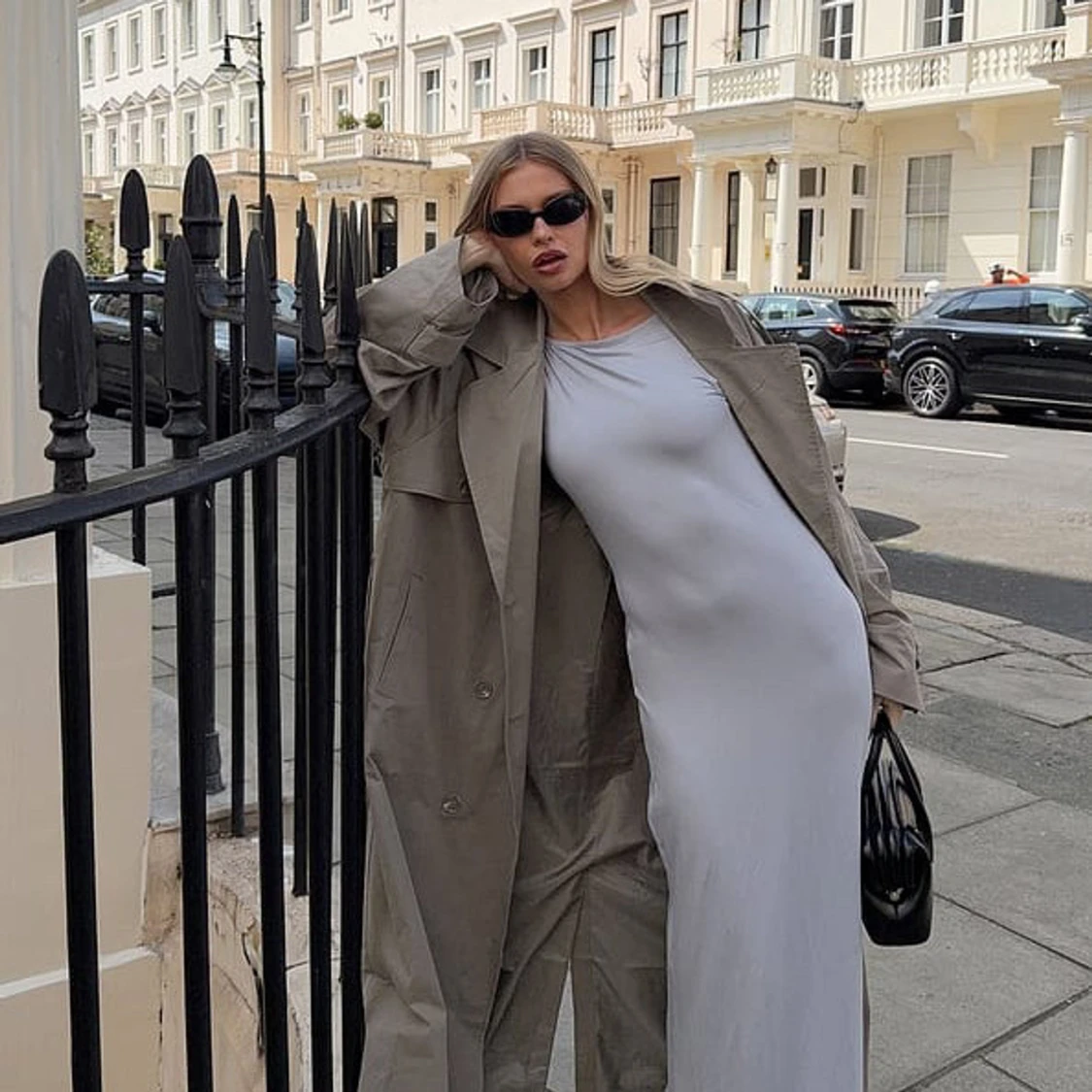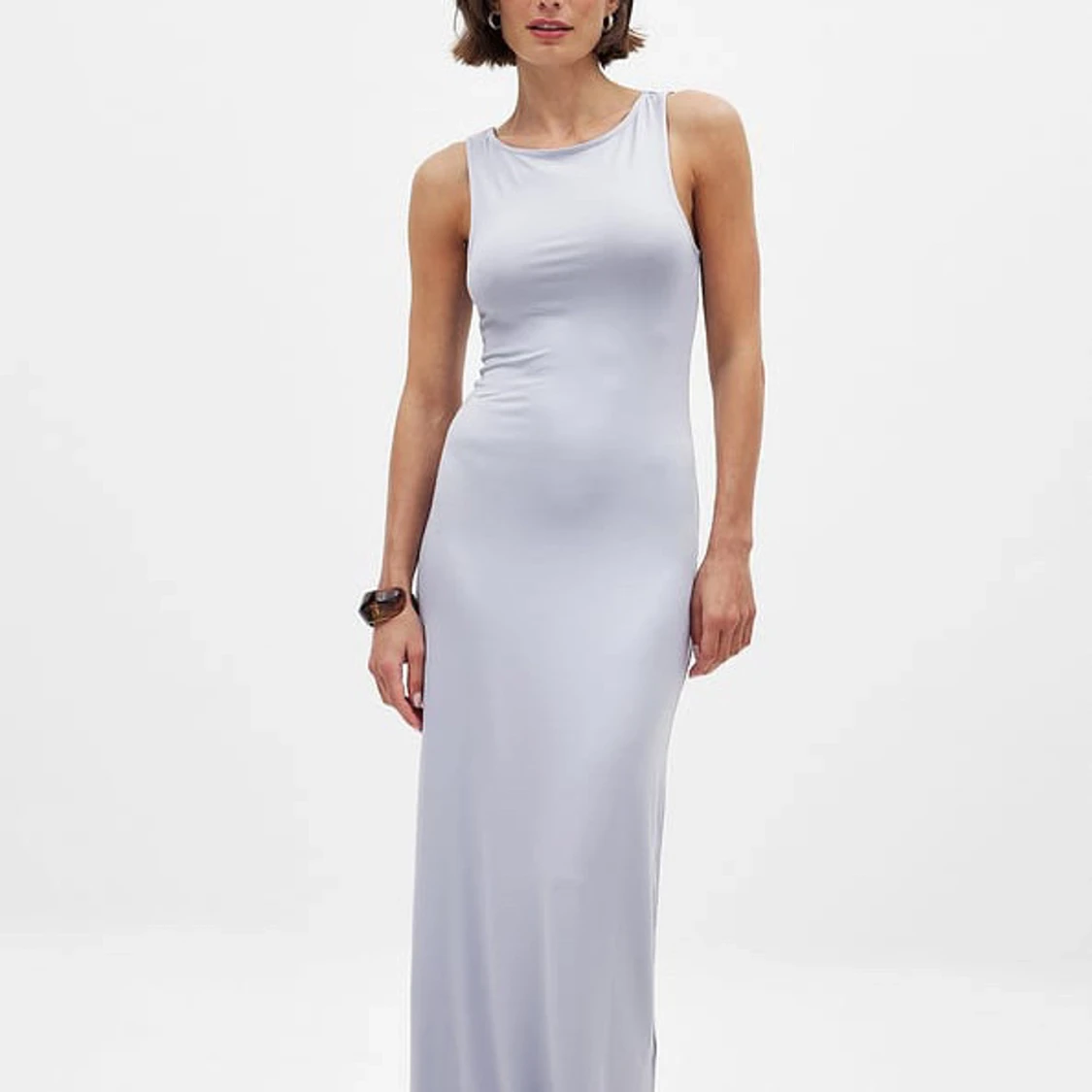 Supersnygg långklänning i ljusgrått med ärmlös design och rund halsringning. Klänningen har en tight passform som framhäver siluetten och är gjord i ett mjukt, stretchigt material som känns bekvämt hela dagen.
