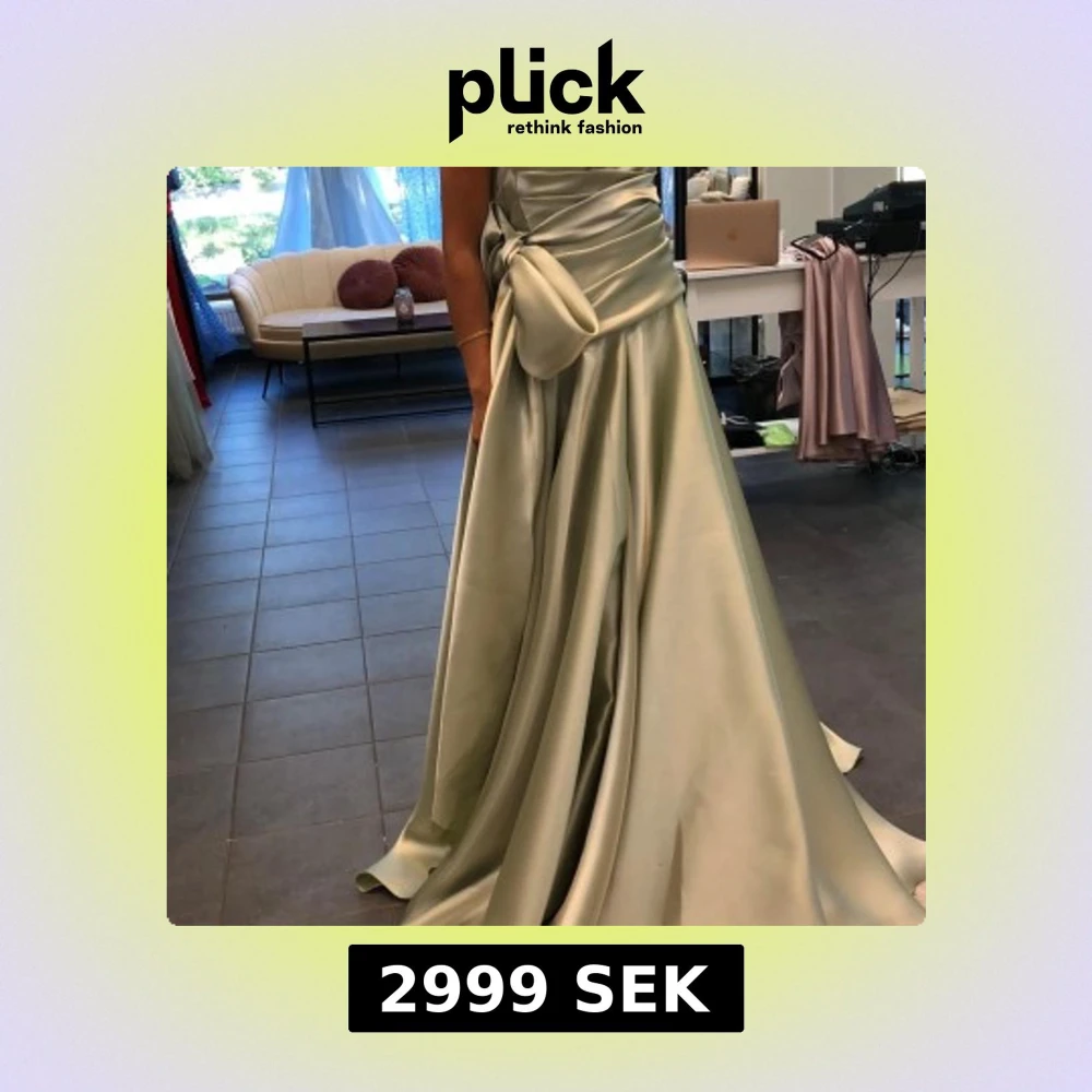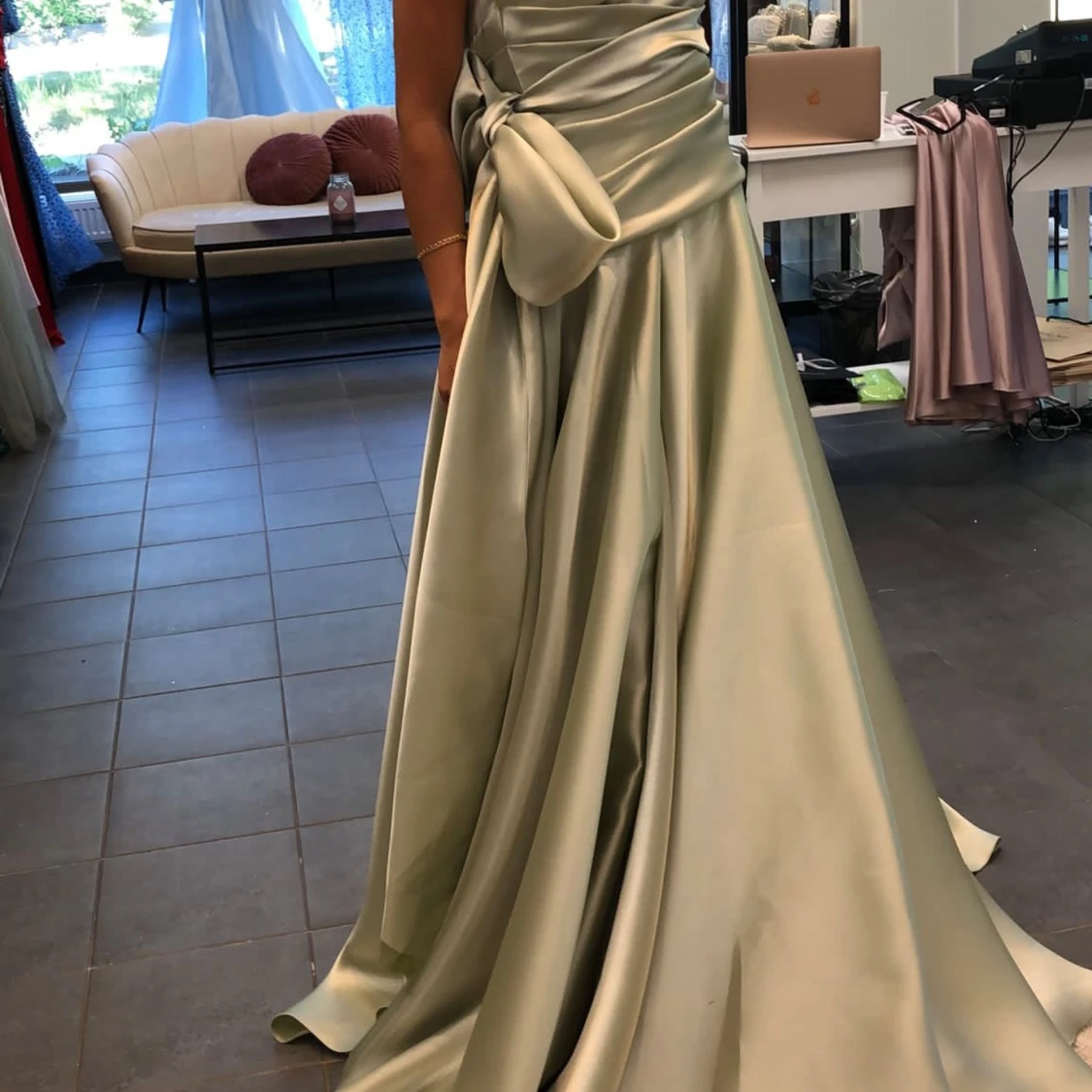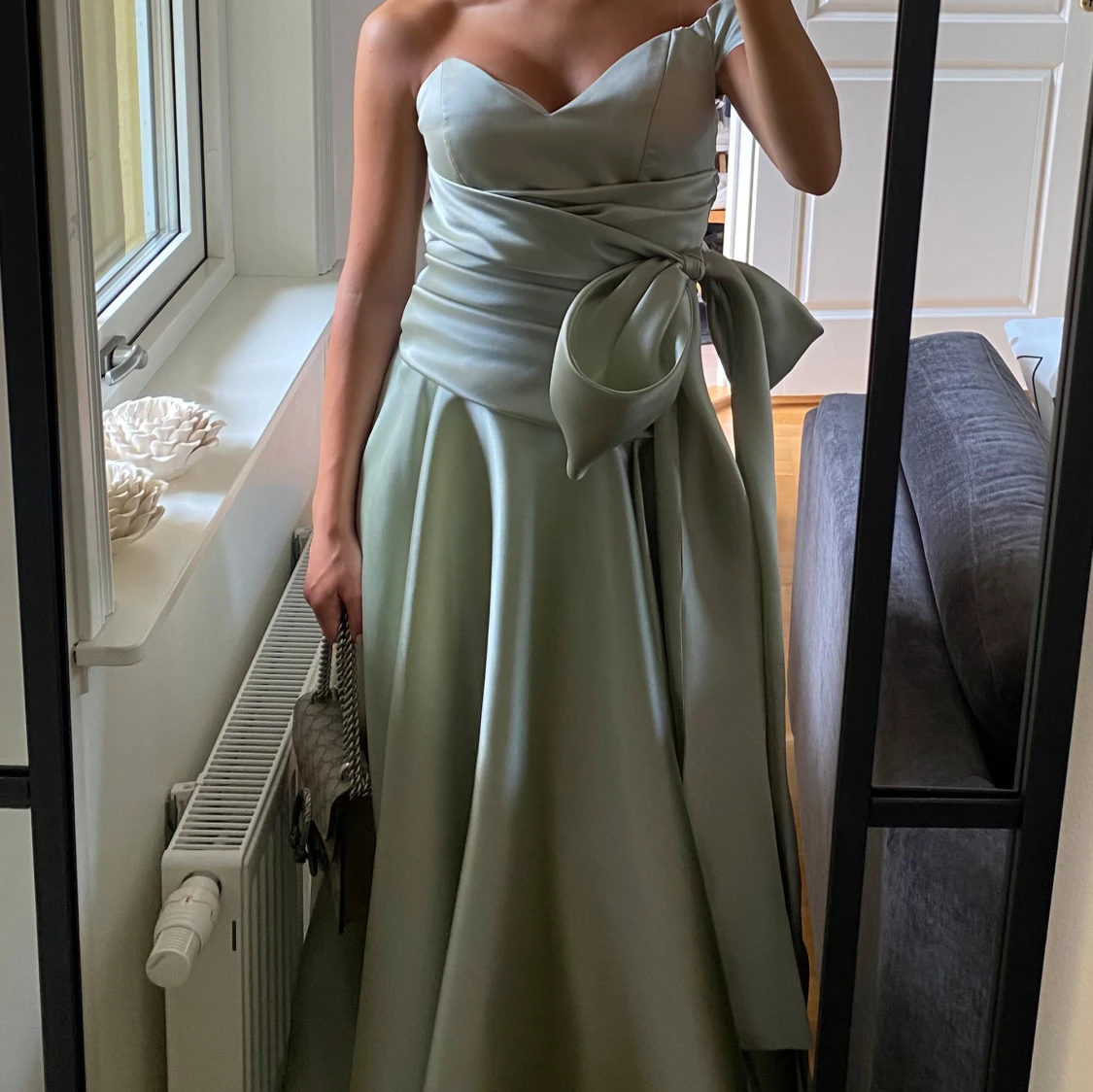 Elegant ljusgrön axelbandslös långklänning i satin med en vacker knytning i midjan. Perfekt för speciella tillfällen där du vill känna dig extra glamorös.
