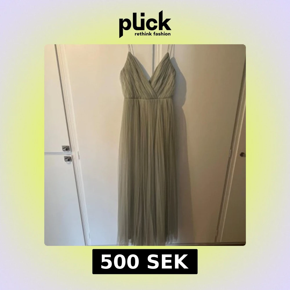 Jättefin mint-/ ljusgrön balklänning med smala axelband och v-ringad omlott. Klänningen har en plisserat tyllkjol med fint fall. Strl 36.