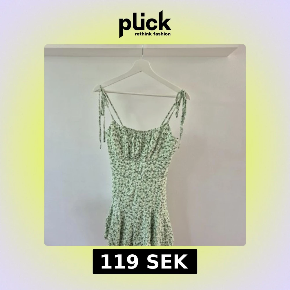 Supersöt ljusgrön jumpsuit(klänning) med små svarta blommor och smala axelband som knyts. Klänningen har en lätt utställd kjol och smockad överdel för en bekväm passform. Perfekt för varma dagar och somriga tillfällen.