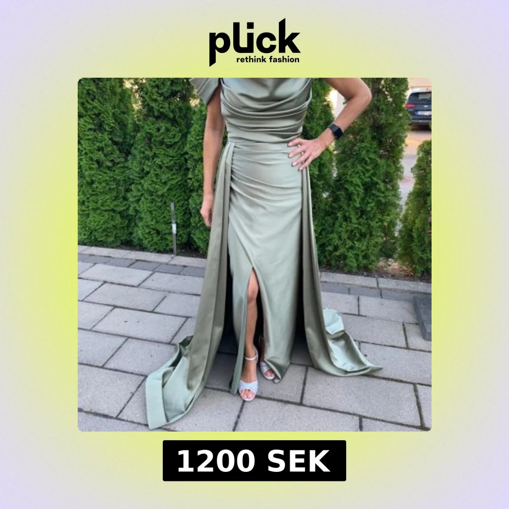 Säljer en elegant ljusgrön långklänning i satin med draperad överdel och hög slits framtill. Klänningen har en axel och lång släp baktill, vilket ger en lyxig känsla. Perfekt för bal eller fest. Snygg passform och vackert fallande material.