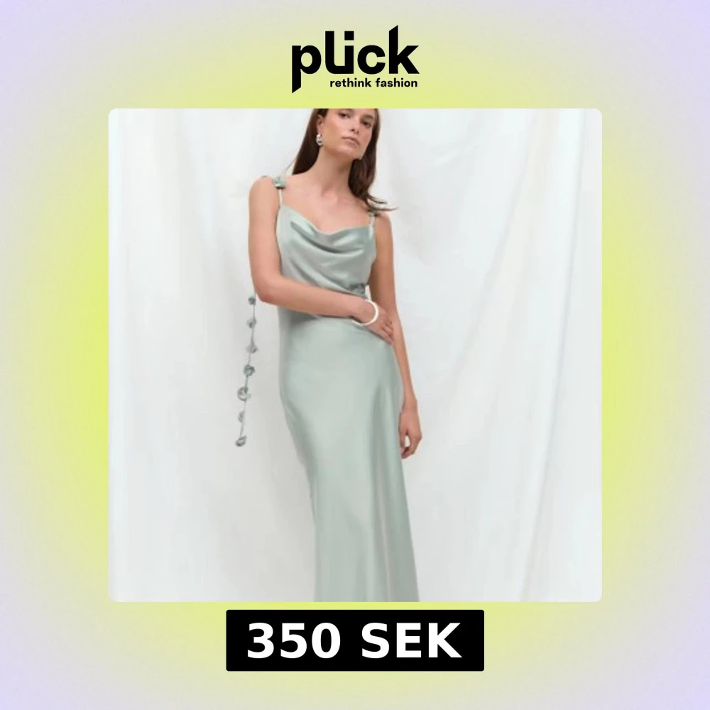 Superfin ljusgrön långklänning i satinliknande material med smala axelband och draperad urringning. Axelbanden har unika rosettdetaljer som hänger ner längs ryggen. Helt ny
