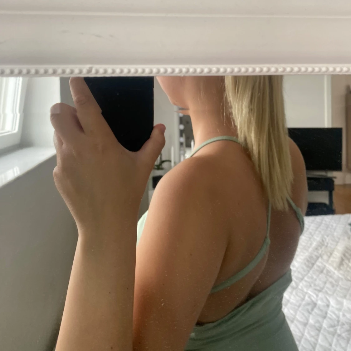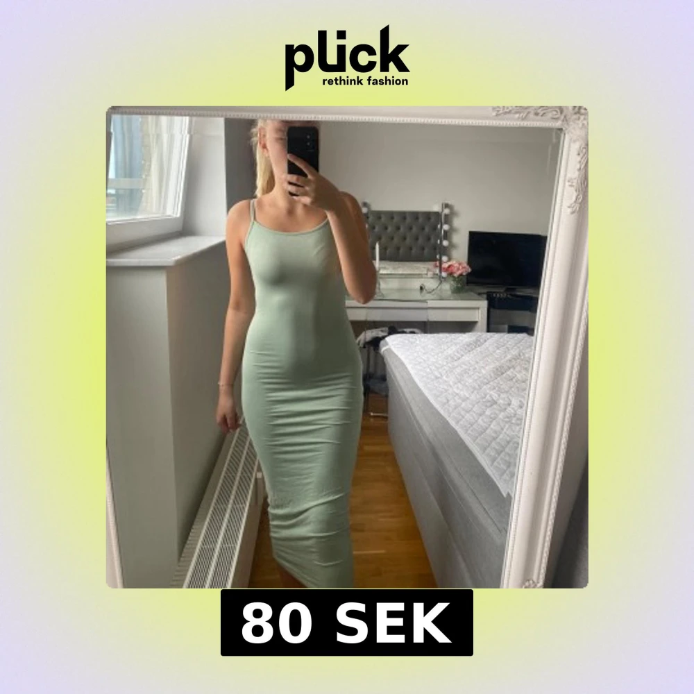 Säljer en ljusgrön långklänning med smala axelband och figurnära passform. Klänningen är ärmlös och har en enkel, stilren design som sitter snyggt på kroppen. Perfekt för dig som gillar minimalistisk och fräsch stil.