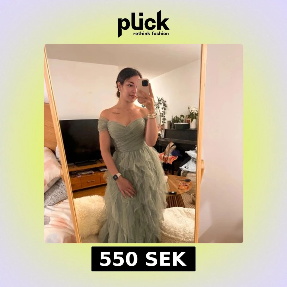 Superfin ljusgrön långklänning med offshoulder och hjärtformad urringning. Klänningen har flera lager volangigt tyg som ger en drömmig känsla och markerad midja. Perfekt för bal eller speciella tillfällen. Materialet är tunt och skirt, troligtvis polyester eller liknande.