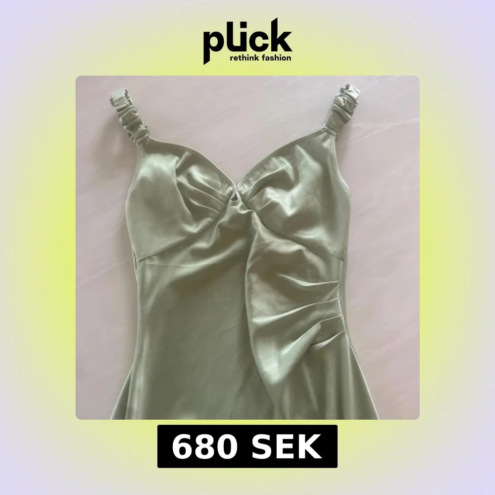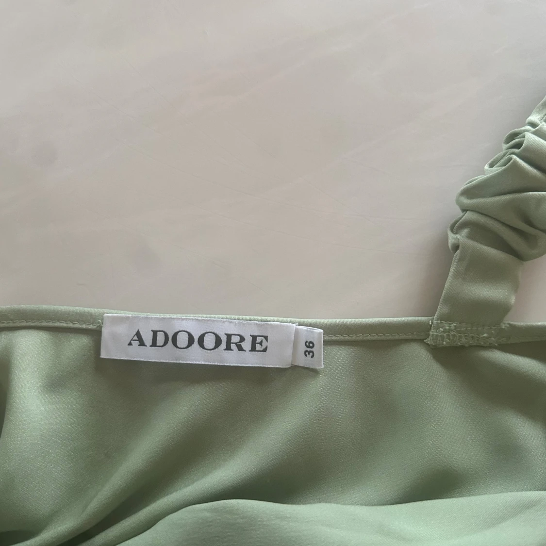 Supersnygg ljusgrön långklänning från Adoore i satin med omlottdetaljer framtill och rynkade axelband. Klänningen har en elegant v-ringning och ett mjukt, glansigt material som ger en lyxig känsla. Använd en gång .