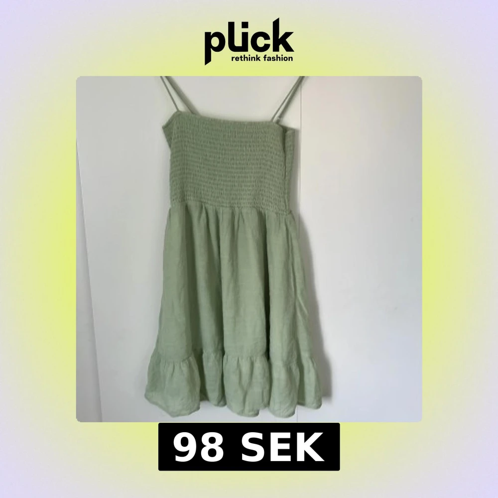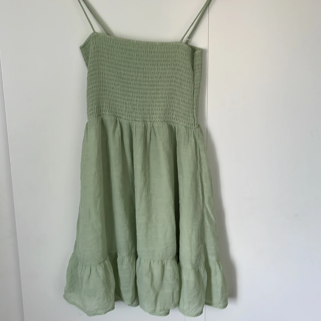 Supersöt ljusgrön klänning med smala axelband och smock upptill. Kjolen är luftig med volangkant nertill, perfekt för varma dagar. Tillverkad i ett mjukt linneliknande material som känns svalt och skönt.
