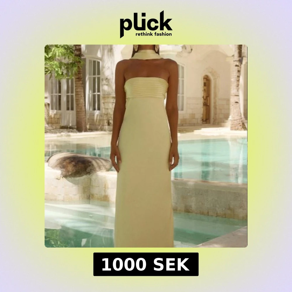 Säljer en elegant ljusgul långklänning med axelbandslös design och ribbad detalj över bysten. Klänningen har en rak siluett och ett stilrent uttryck, perfekt för dig som vill sticka ut med en sofistikerad look.