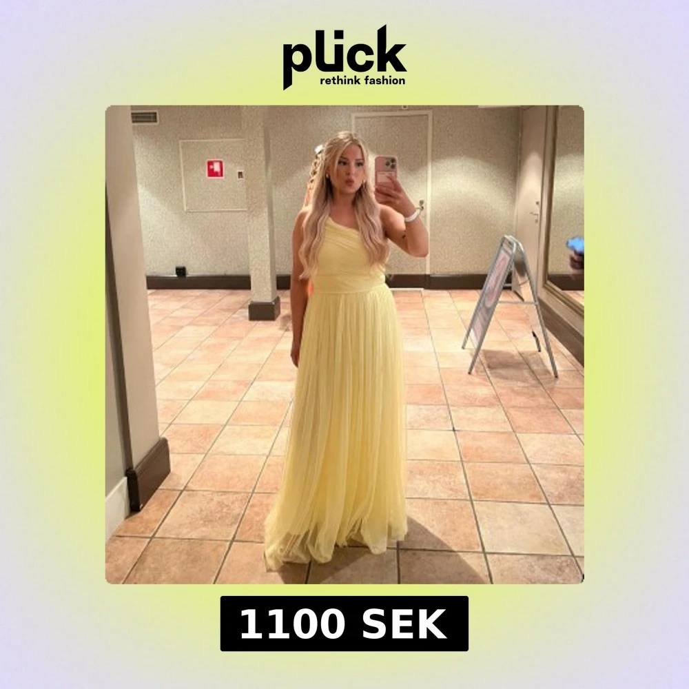 Säljer nu min fina balklänning som är ljusgul. Det är en one shoulder maxiklänning som har en markerad midja. Superfin och passade mig som är 160 perfekt. Har klackar på mig på bilden så den som är några cm längre än jag kommer också kunna använda den. Storlek 40 men passar både en storlek M som L.