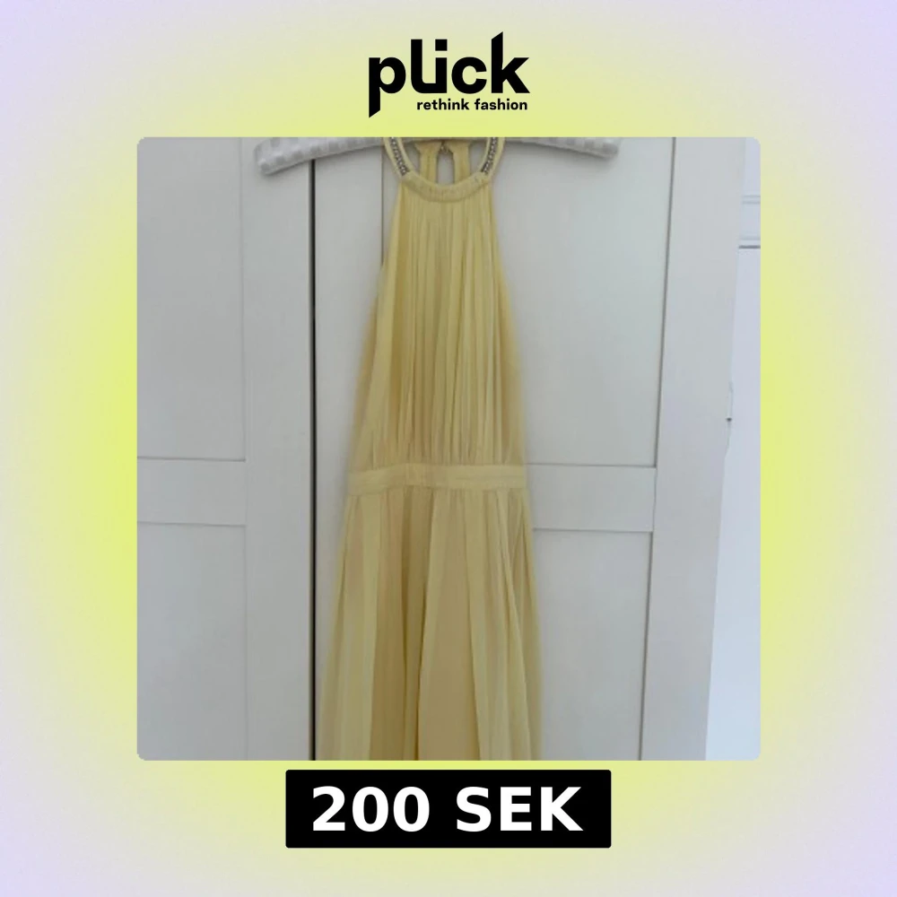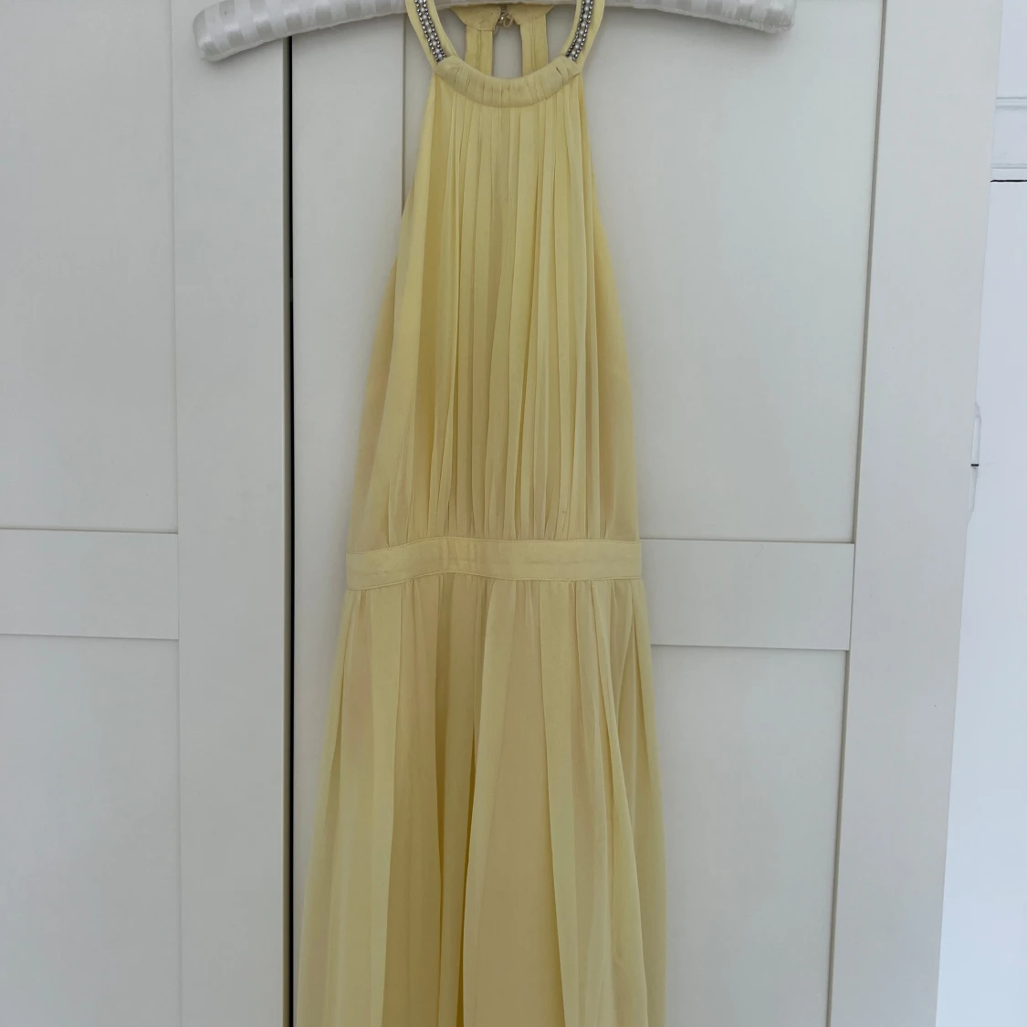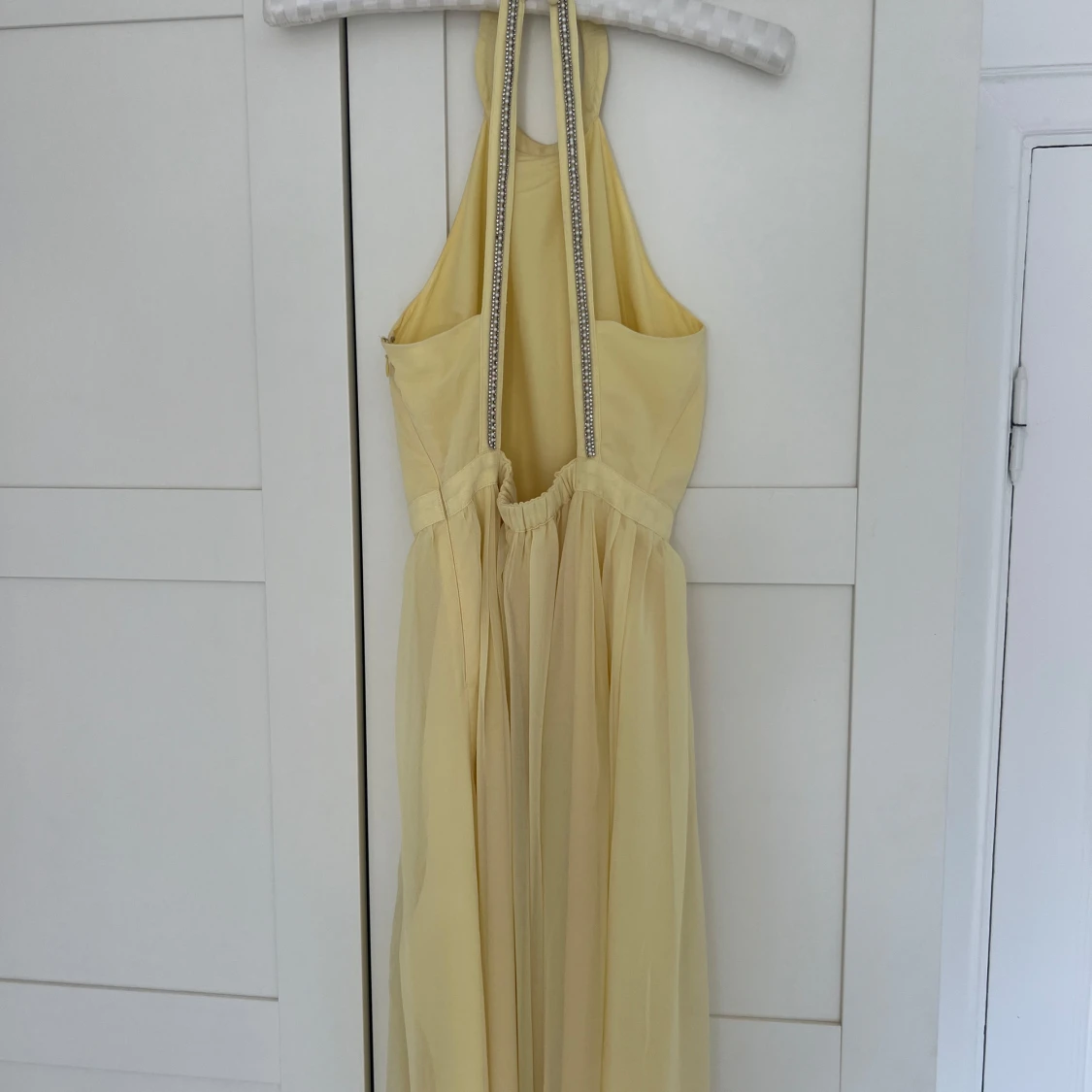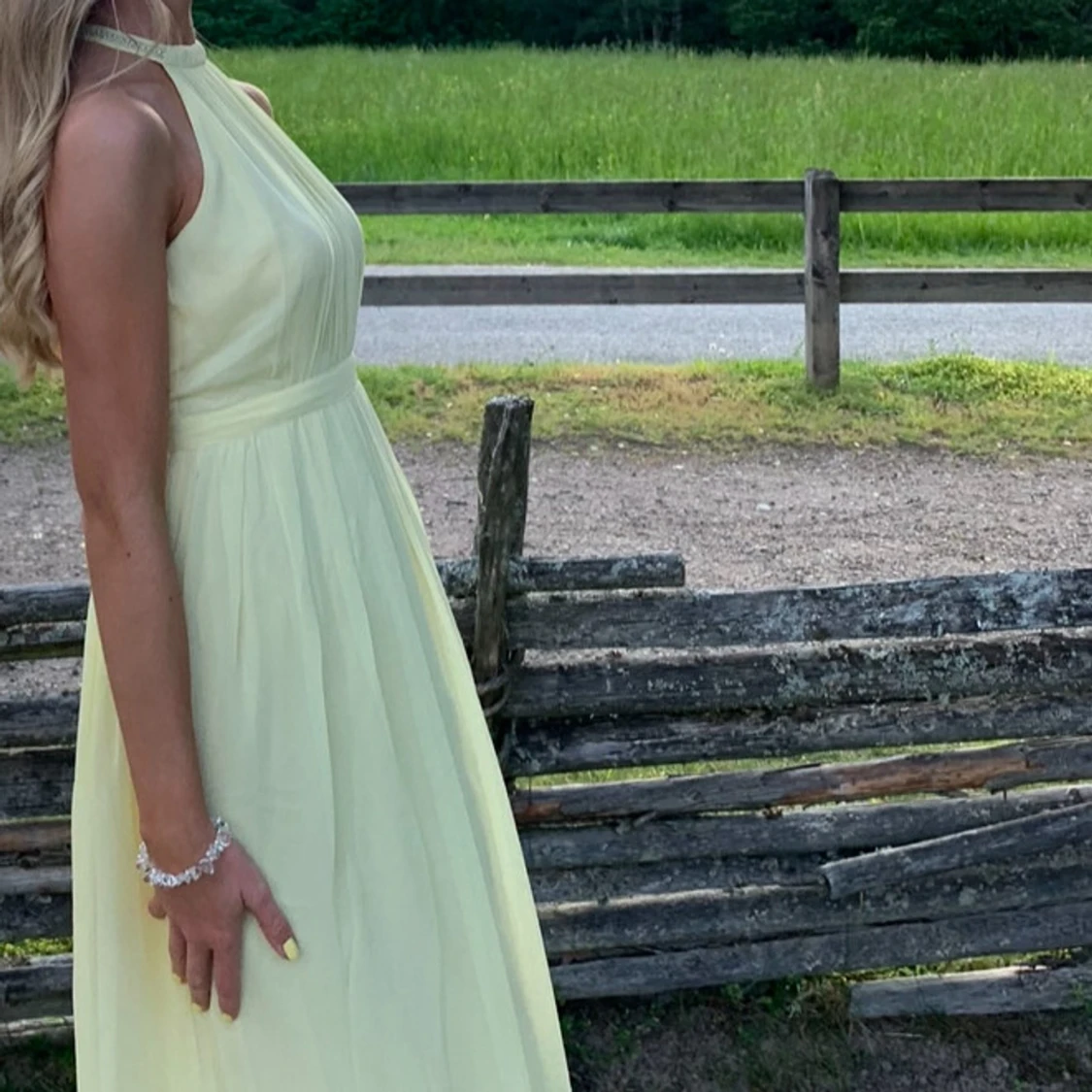 Supersöt ljusgul långklänning med halterneck och smala axelband dekorerade med stenar. Superfin till bal🩷