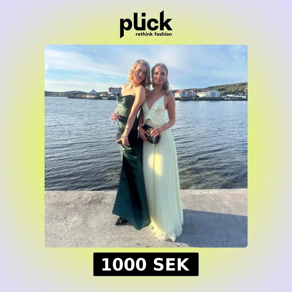 Elegant ljusgul långklänning med djup v-ringning och omlottliv. Klänningen har tunna axelband, öppen rygg med snörning. Köpt på Asos, perfekt för bal. Sömmarna längst ner är lite öppna och därmed priset. Inget man tänker på.