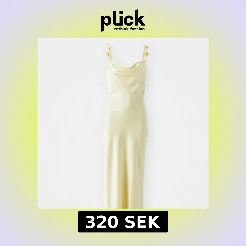 Supersnygg ljusgul långklänning från Gina Tricot med tunna axelband dekorerade med blommor. Klänningen har en mjuk satinliknande yta och öppen rygg. Endast använd en gång, storlek S. skriv för fler bilder