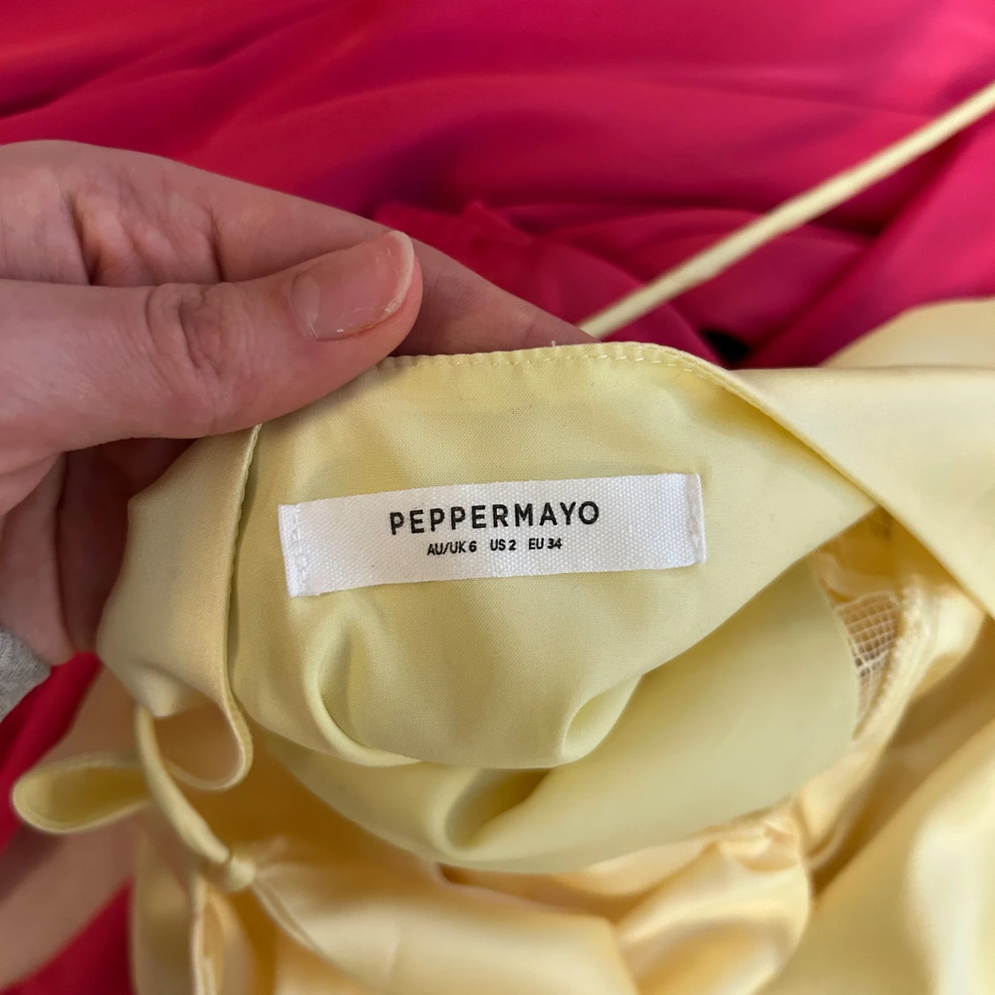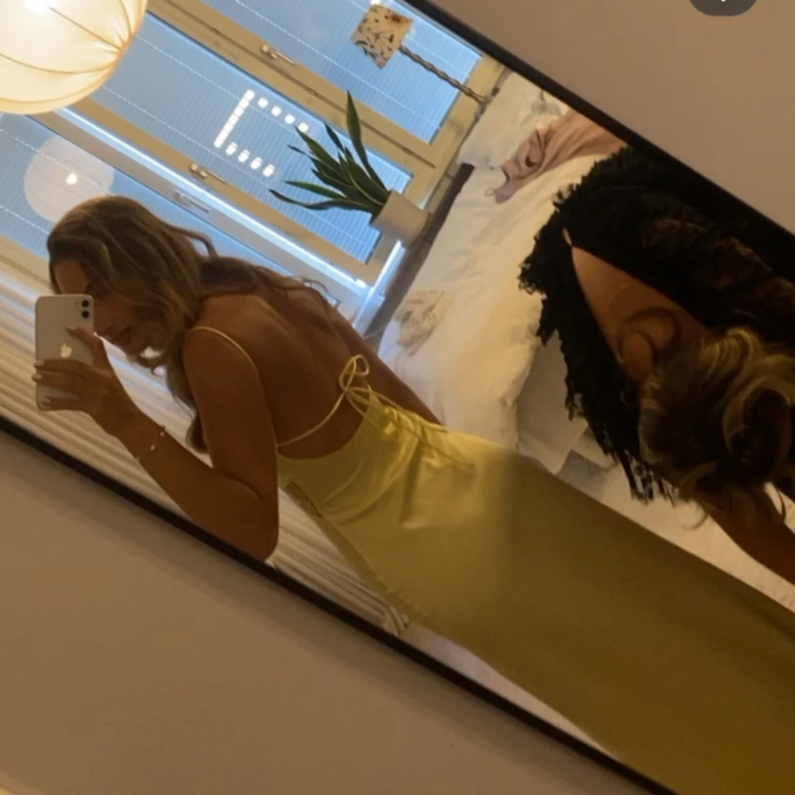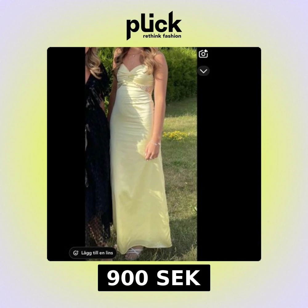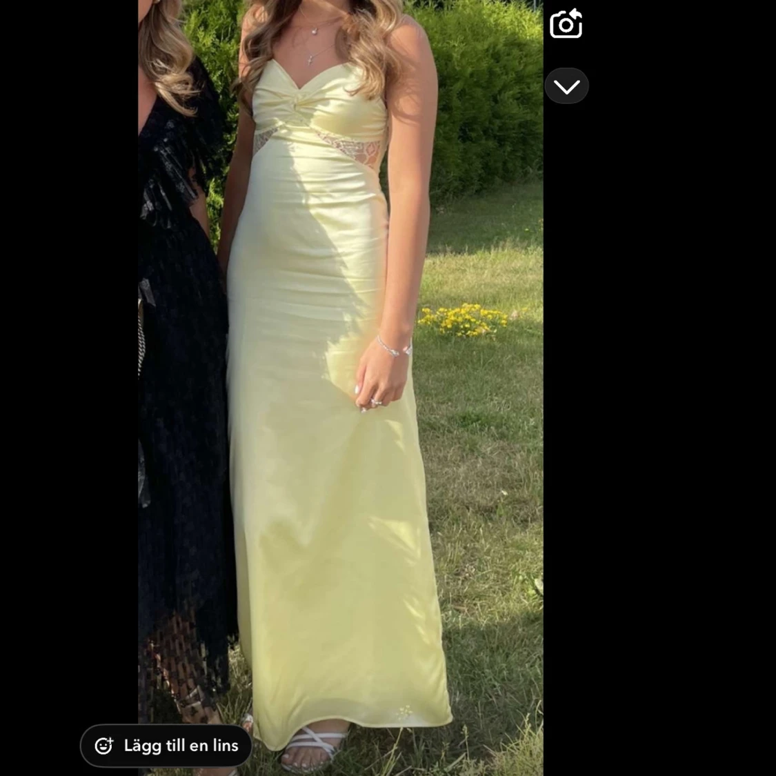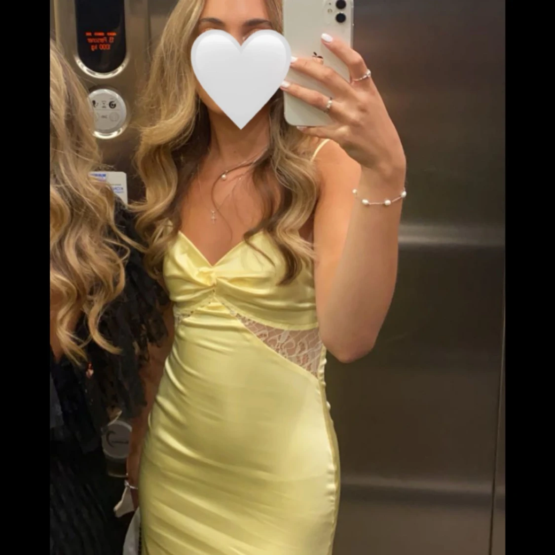Säljer en ljusgul långklänning från Peppermayo med smala axelband och öppen rygg. Klänningen har v-ringning och fina spetsdetaljer i midjan. Perfekt för sommaren och till balen! 💛 Endast använd vid ett tillfälle