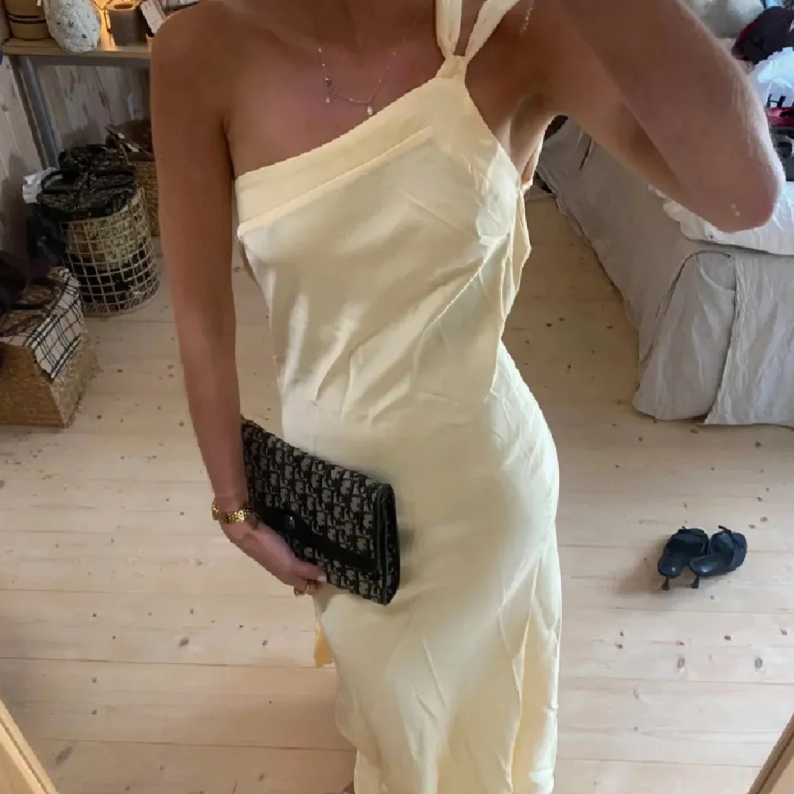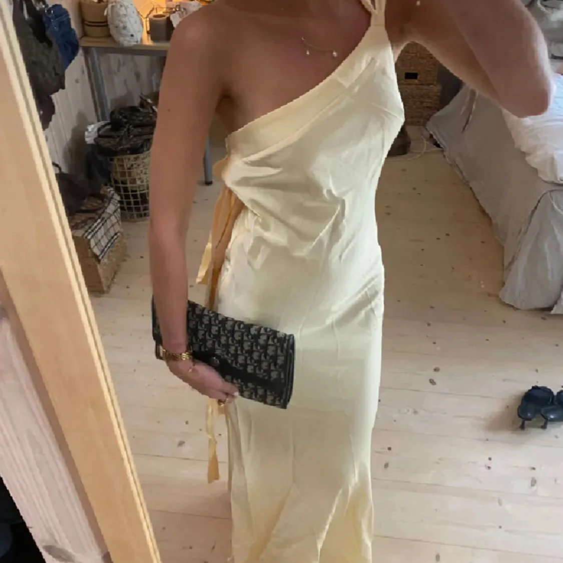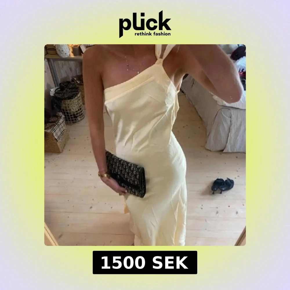 Superfin ljusgul långklänning med oneshoulder och öppen rygg från by stina💗. Klänningen har ett snyggt knytband i ryggen och är figurnära med slät, elegant look. Perfekt för sommarens speciella tillfällen och ger en riktigt chic vibe. Använd 1 gång